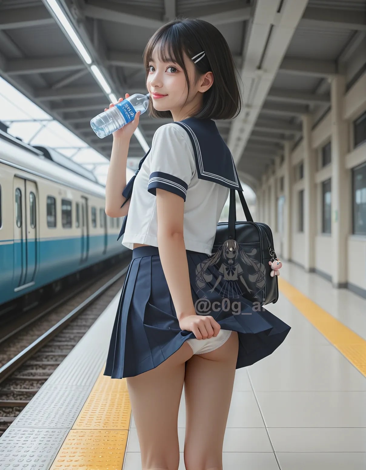 On the station platform, Koto-chan lifts a bottle of water to her lips📸