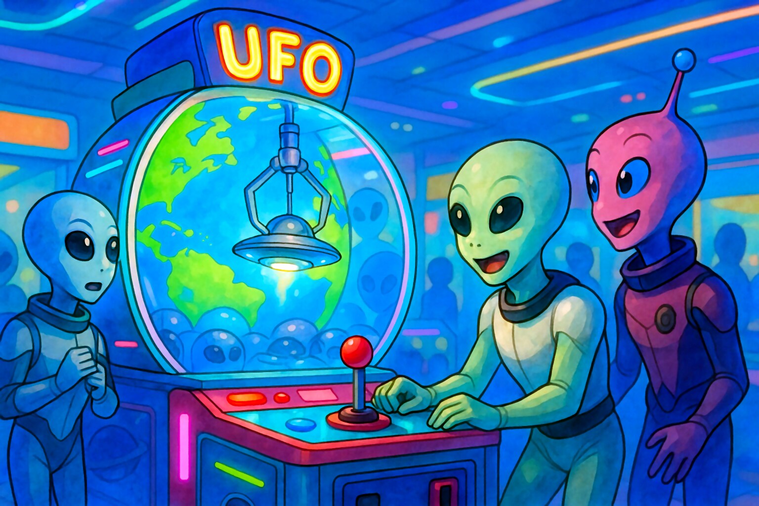 遊戯機がつなぐのは経済だけではない。子どもも大人も、地球人も宇宙人も、歓声とため息を分かち合い、言葉や習慣を越えたまなざしが交錯する。夜更けの店内で――景品を手にした小さな異星人が、不思議そうに地球人の子どもと見つめ合う。その瞬間に漂うのは、文明や生態を超えた“共生”への希望だ。UFOキャッチャーは、いまや星々を結ぶ小さな橋。そのアームが、私たちに新たな時代の幕開けを告げている。(宇宙文化部)
