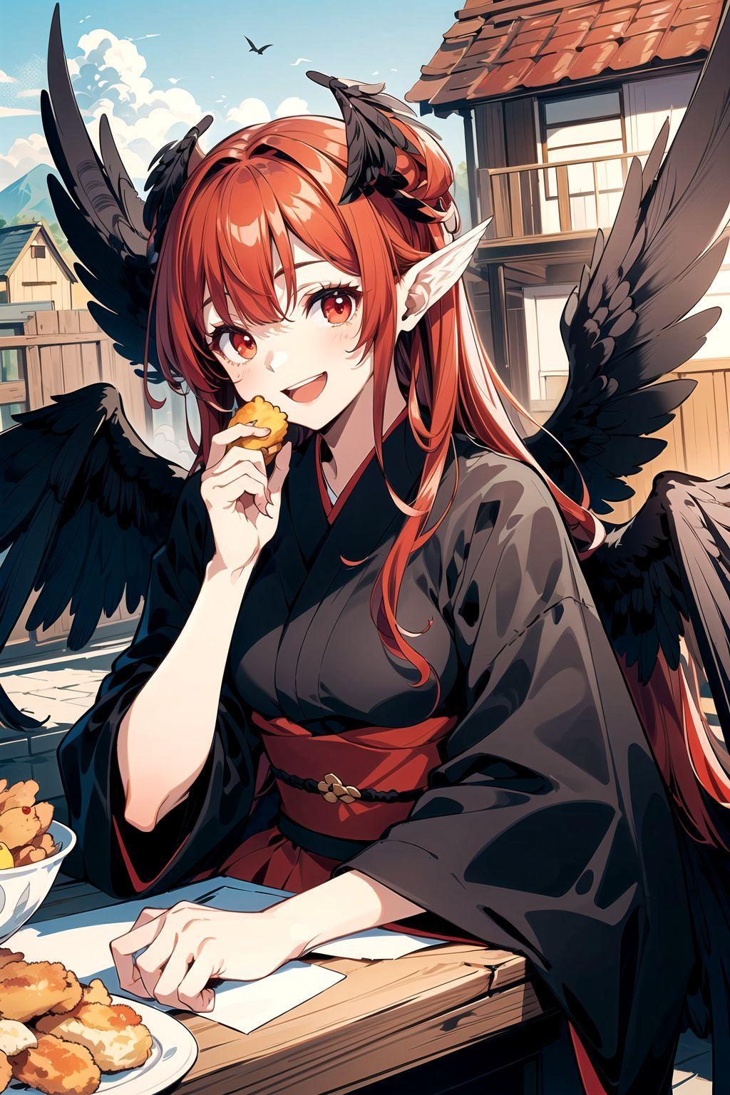 から頂いた唐揚げを食べてる八咫烏
