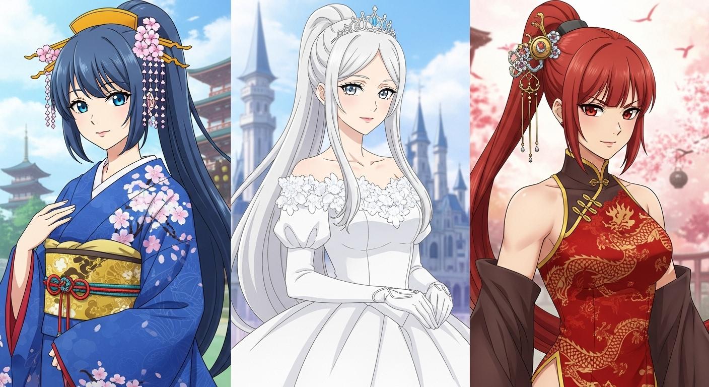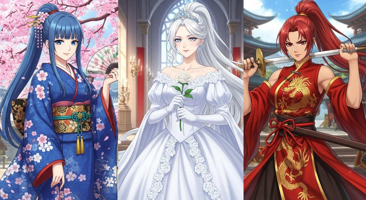 和・洋・中を象徴する三人の“ぽに姫”たちが並び立つシーン。