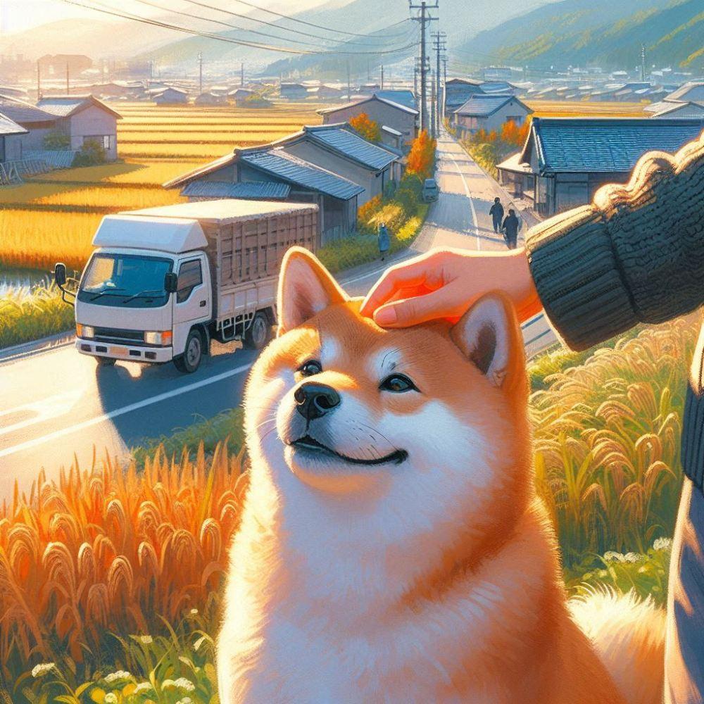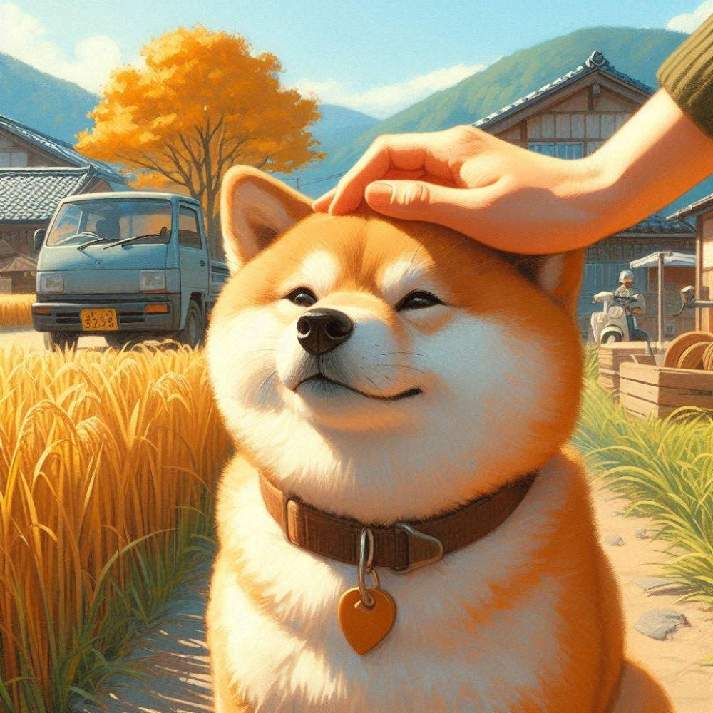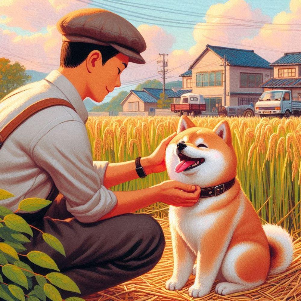 アクリル、嫉妬して機嫌の悪いふくれっ面の柴犬の頭を優しく撫でてご機嫌をとる