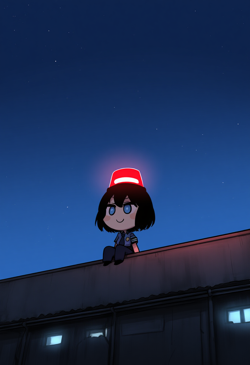 girl, blue eyes, black hair, short hair,red police siren light on head, {{{chibi}}}, police, sitting, smile