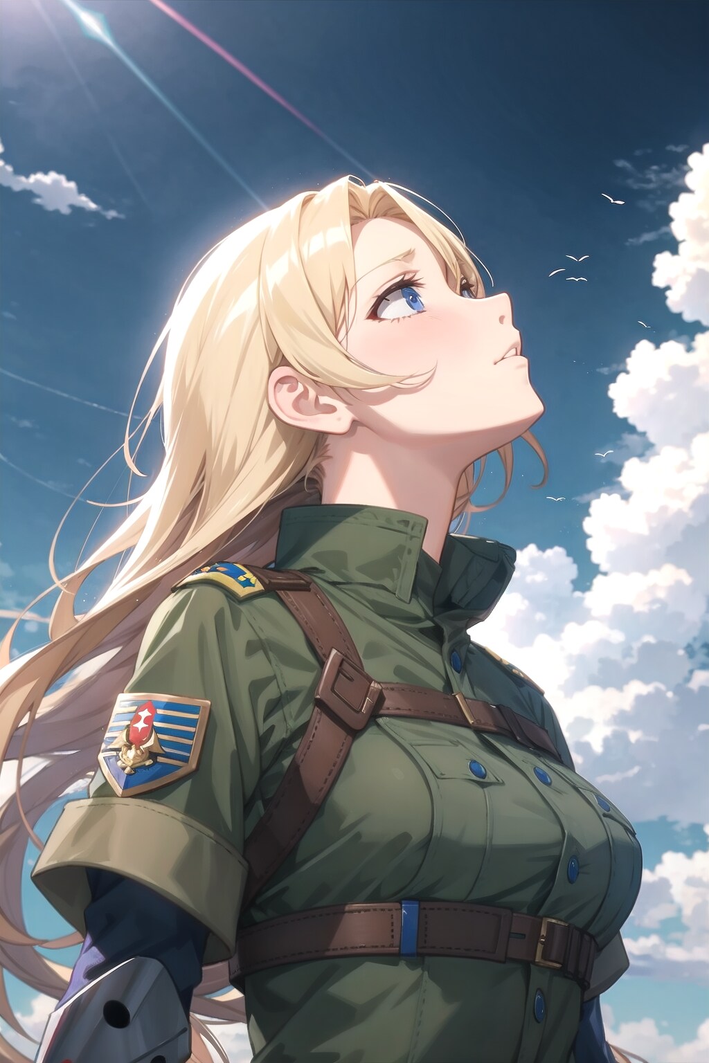 戦いが済み、ふと我に返り空を見上げる美しい女性兵士。