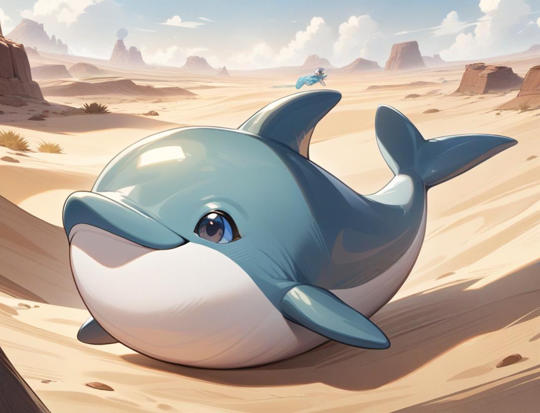 イズン大陸西側のオリエント砂漠に生息する砂漠イルカ、フグみたいに膨らんで腹の中に水を溜めている。