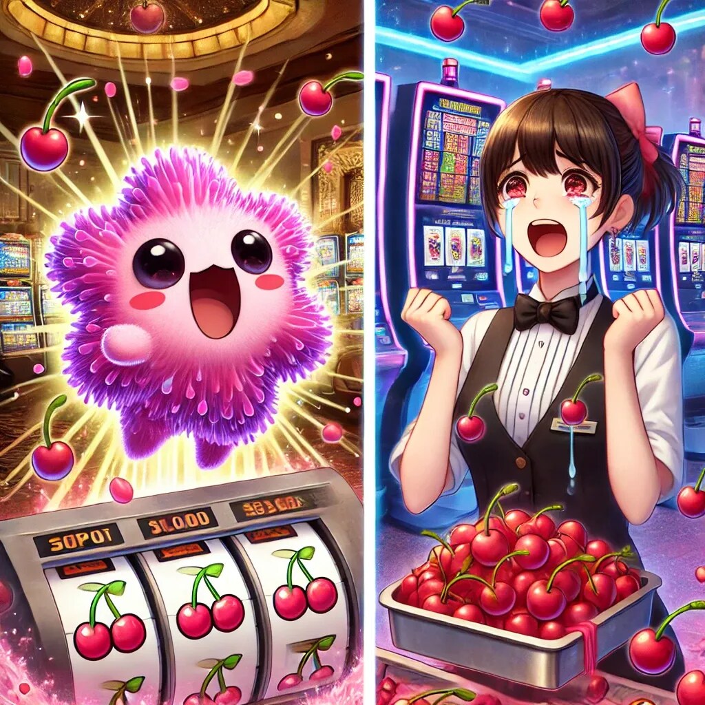 スロットが毎回フィーバー状態に。チェリーが降り注ぎ、メダルが溢れ、ディーラーは青ざめる…。