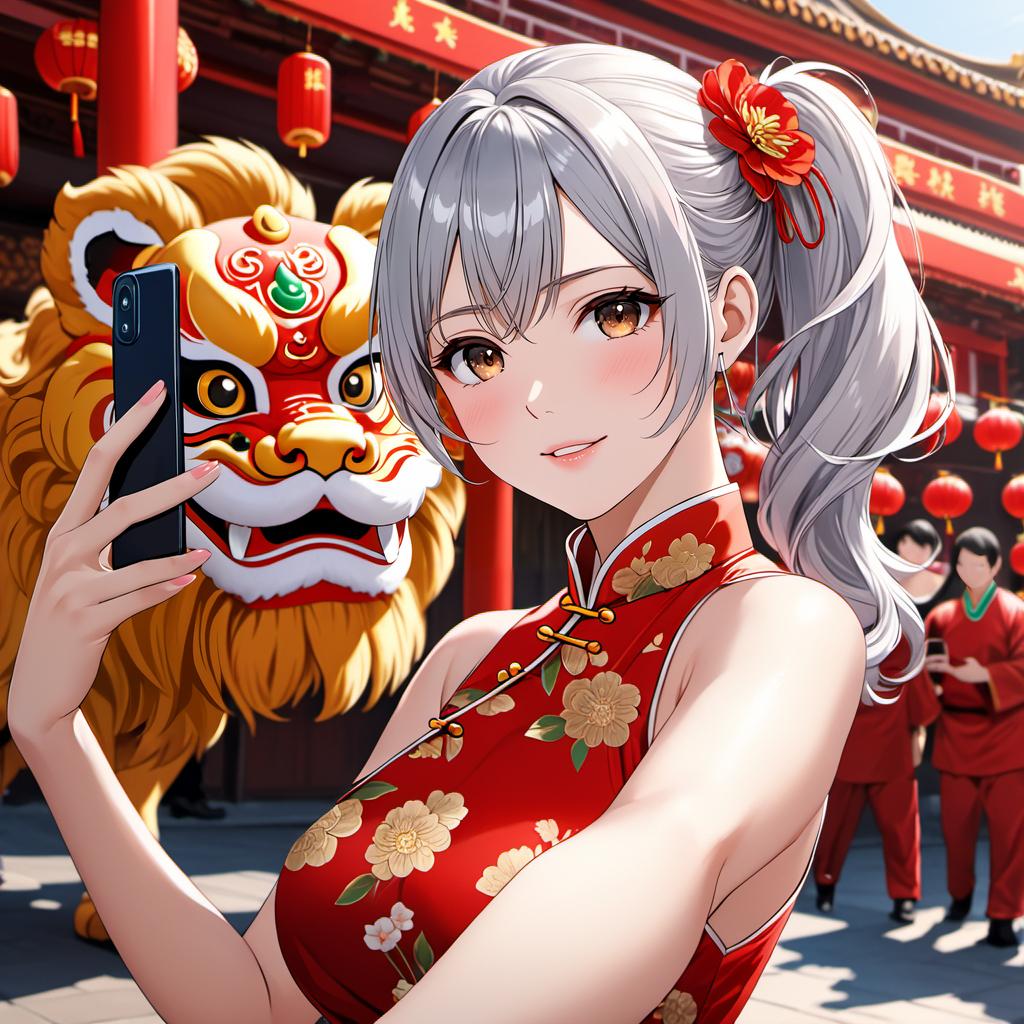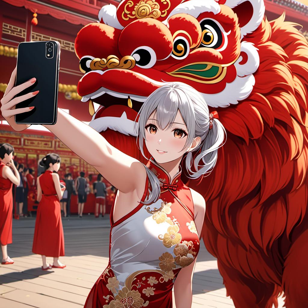 周りにあまり気にせず自撮りしまくる女子に獅子舞が近づき