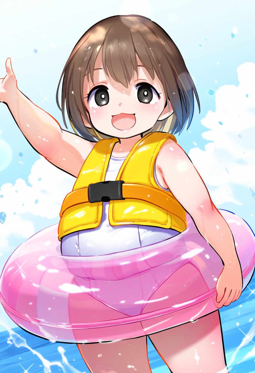 ライフジャケットと浮き輪で出ているお腹も誤魔化しています(^ー^)笑