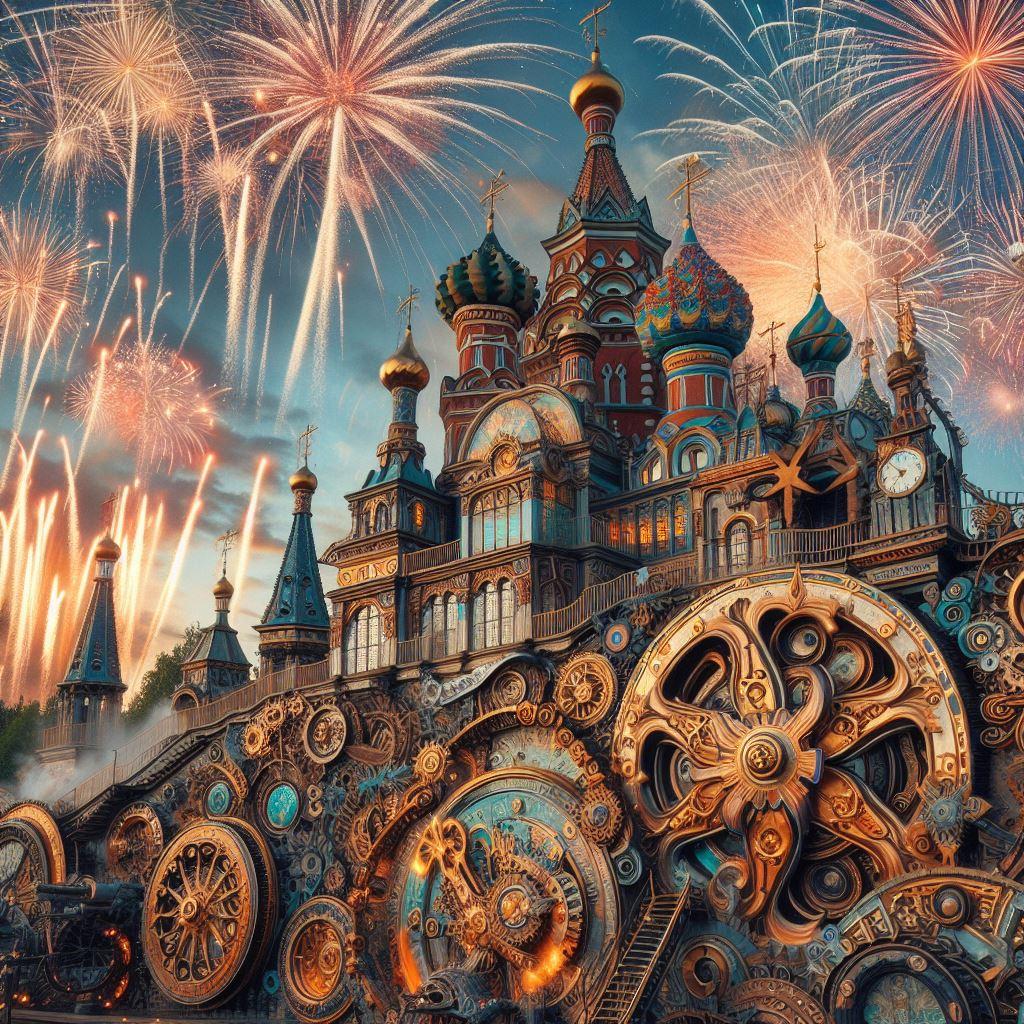 プロンプト:遊園地の花火大会をスチームパンクスタイルで表現してください。