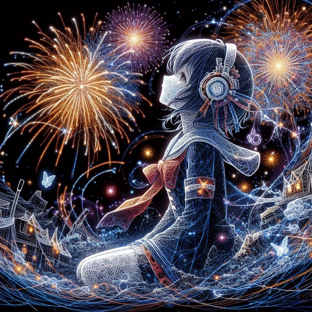 プロンプト:花火大会をワイヤーアートのアニメイラストで表現してください。