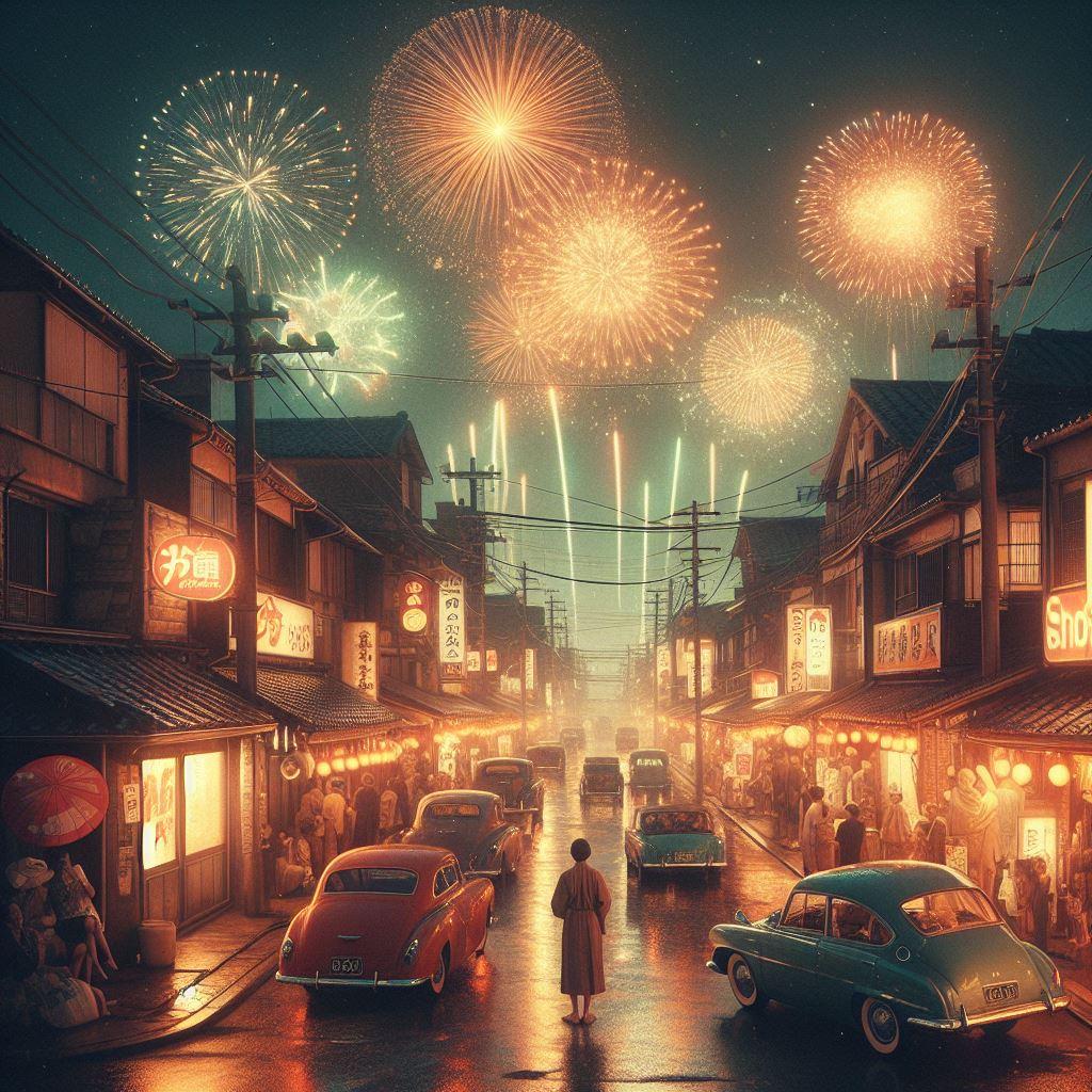 プロンプト:昭和の花火大会を懐古主義スタイルでイラストに表現してください。