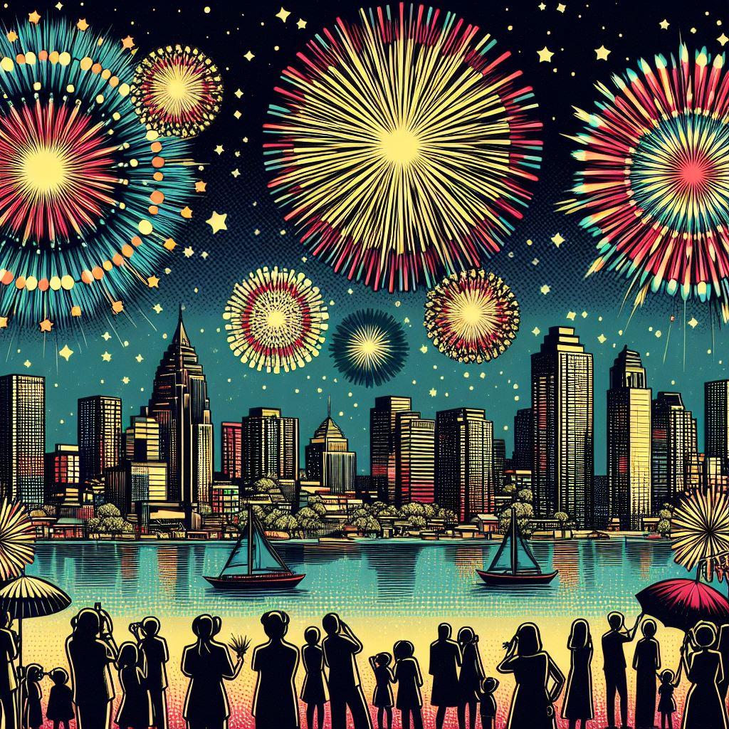 プロンプト:花火大会をカラーのシルエットイラストで表現してください。