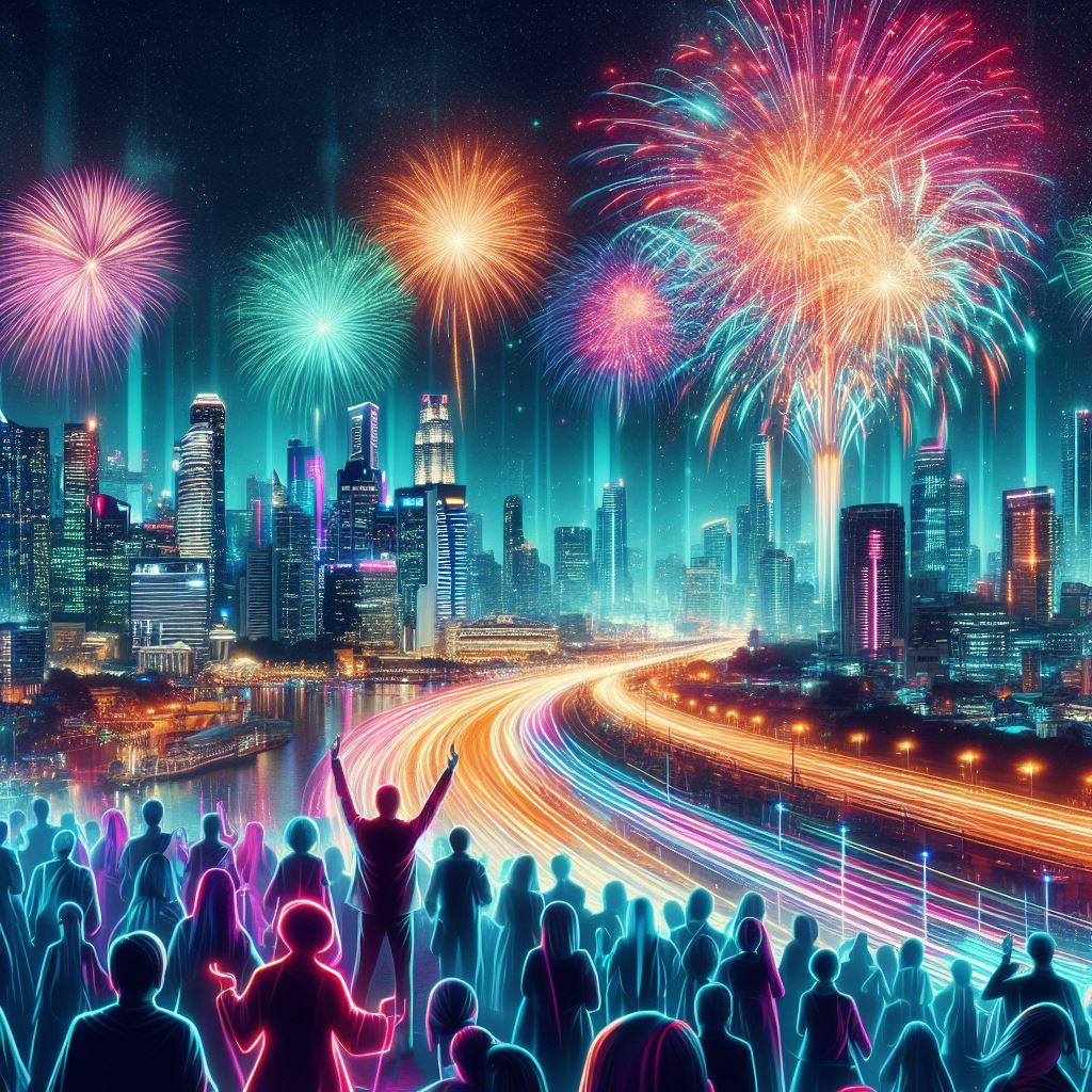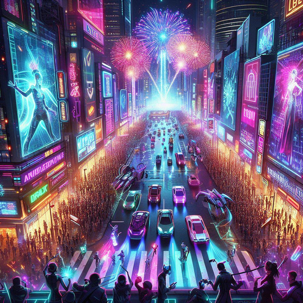 プロンプト:サイバーパンクスタイルで花火大会を表現してください。