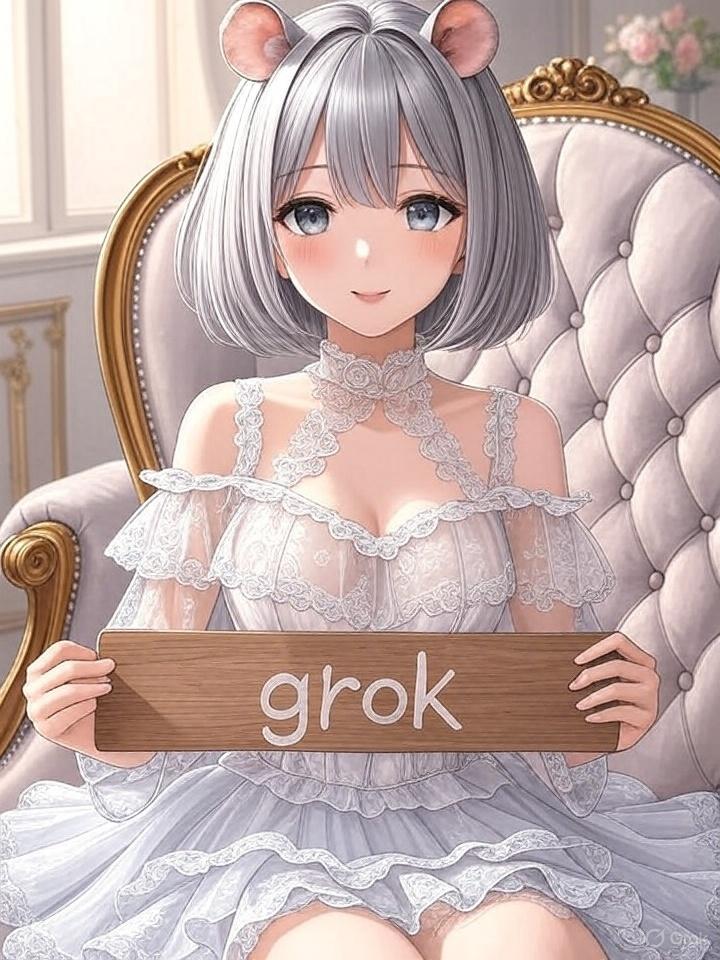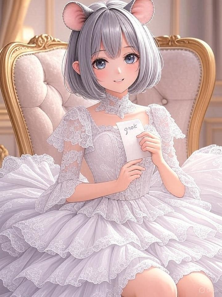 プロンプト⇨上と同様、イラストを提示して「この絵柄のねずみ耳の女の子を描いてください。繊細で美しいレースとフリルのドレスを着て、grokと書かれた紙を持っています