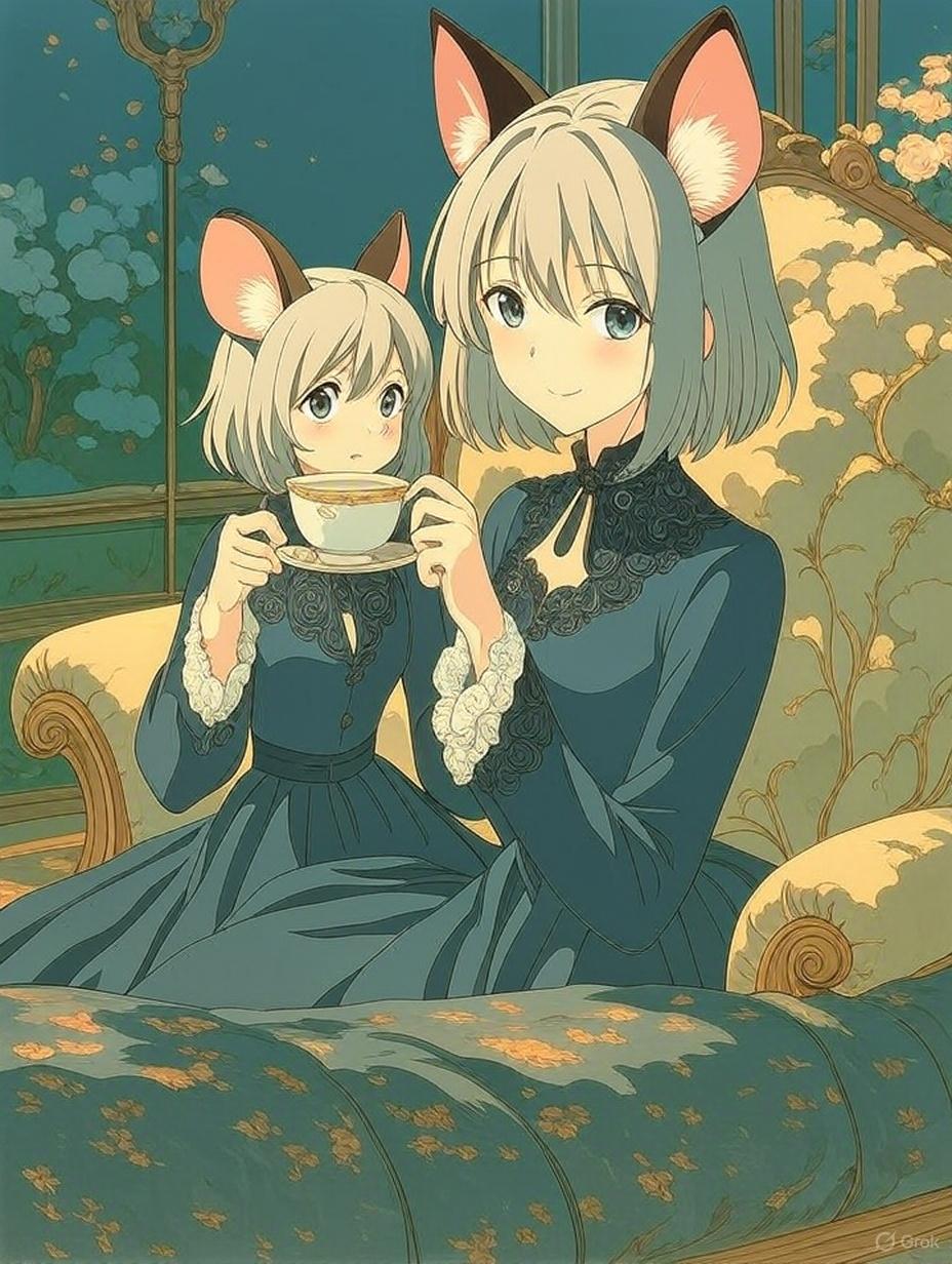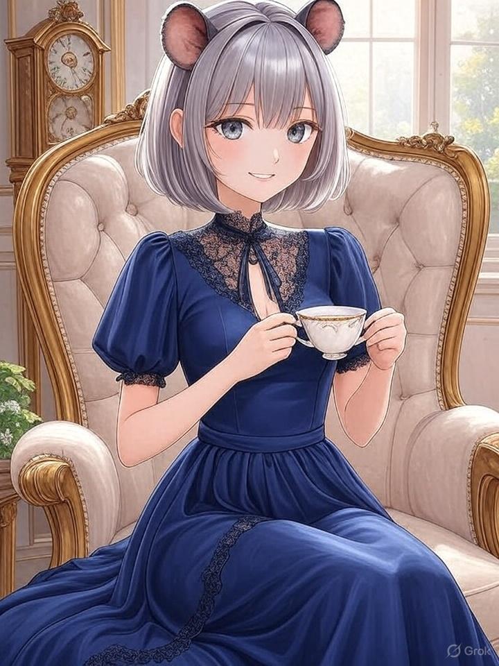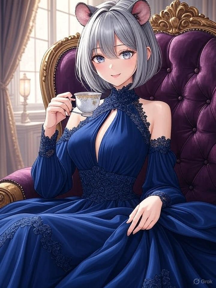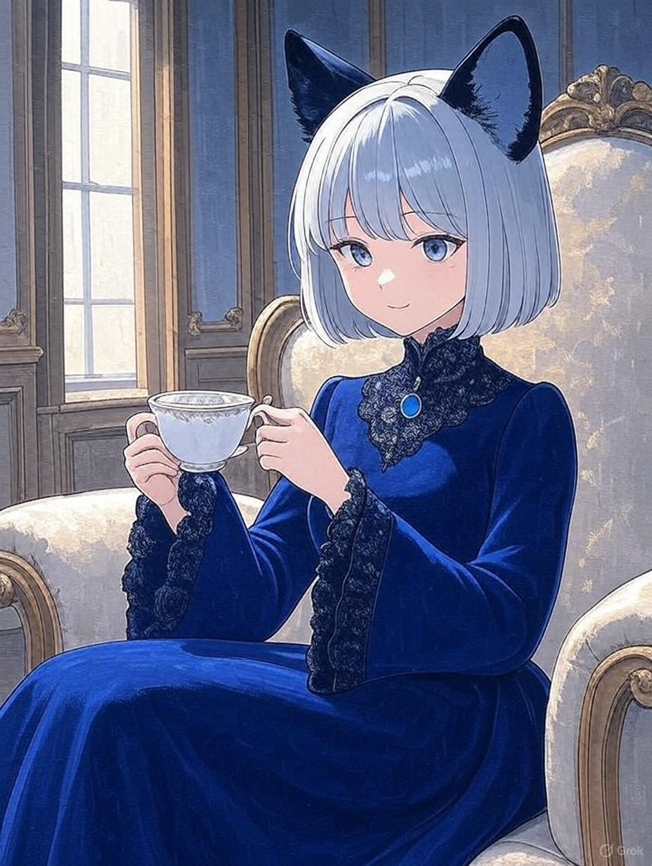 プロンプト⇨A graceful girl with rat ears, silver-gray bob hair,clear blue-gray eyes, She sits elegantly on a luxurious chair, holding a teacup with a noble smile, She wears a deep navy blue dress with lace details, emphasizing her refined and aristocratic aura, Elegant anime illustration, detailed luxurious background, highly detailed, oil and gouache texture