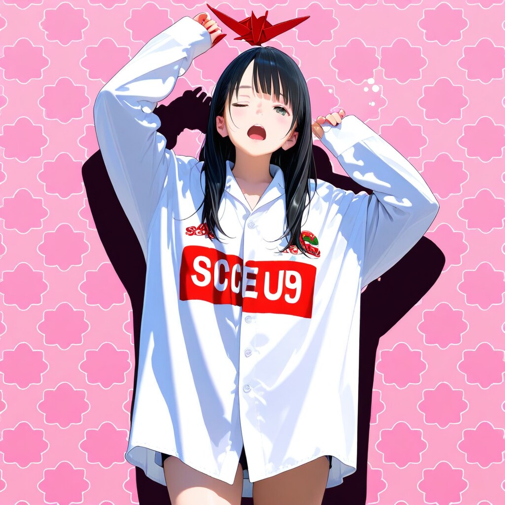 寝起きにオーバーサイズシャツで着た黒髪美人、そして何故か浮遊している折り紙!?