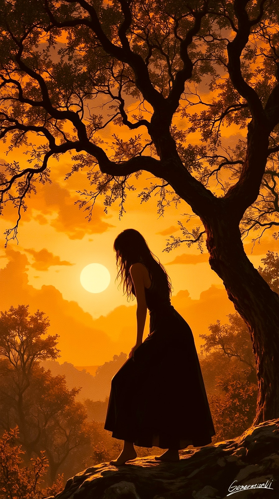 風は止まり、木々は影だけを残し、沈みゆく陽が彼女の輪郭を柔らかく包む。