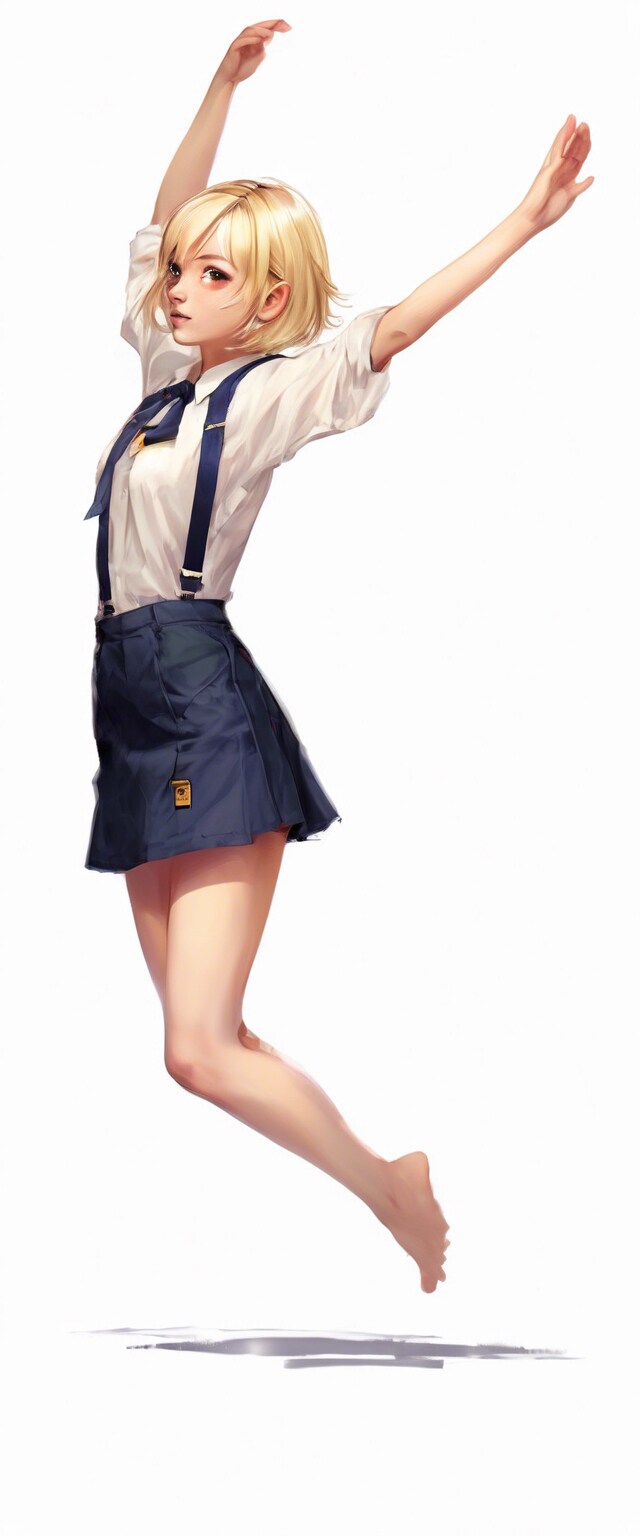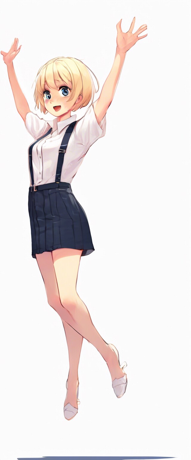 高校生が小学生の頃の制服(吊りスカートと白いブラウス)を着てみると、背が伸びててスカートが短くなっていた