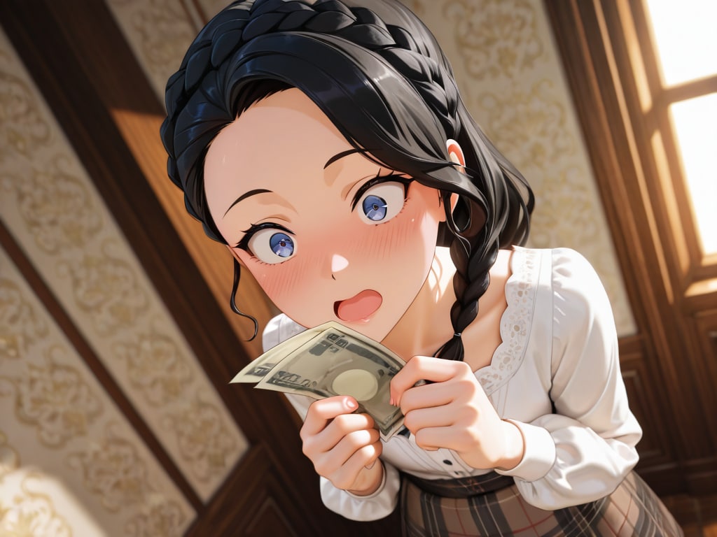 プロンプトコーナー。今回はNova Anime3D XL一択で行きました。「こっ、これが一万円札!?ゴクリ(汗...」と声が聞こえて来そうな絵面にしました。まあ、ほぼガチャでしたけど(汗...