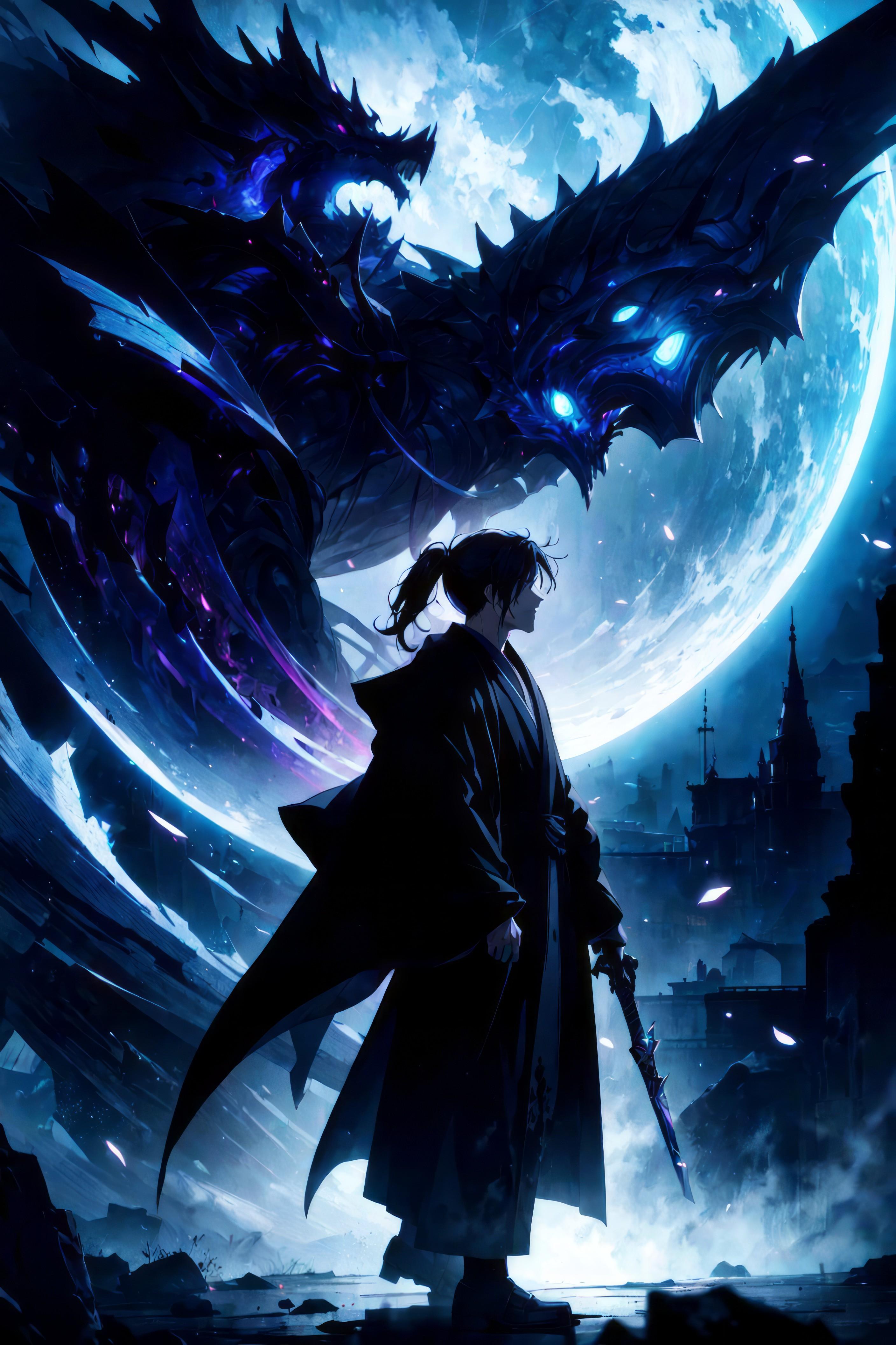 月光が静かに地を照らし、その輝きに抱かれた男の横には、龍か機械か、その境界すら曖昧な巨竜が佇んでいた。