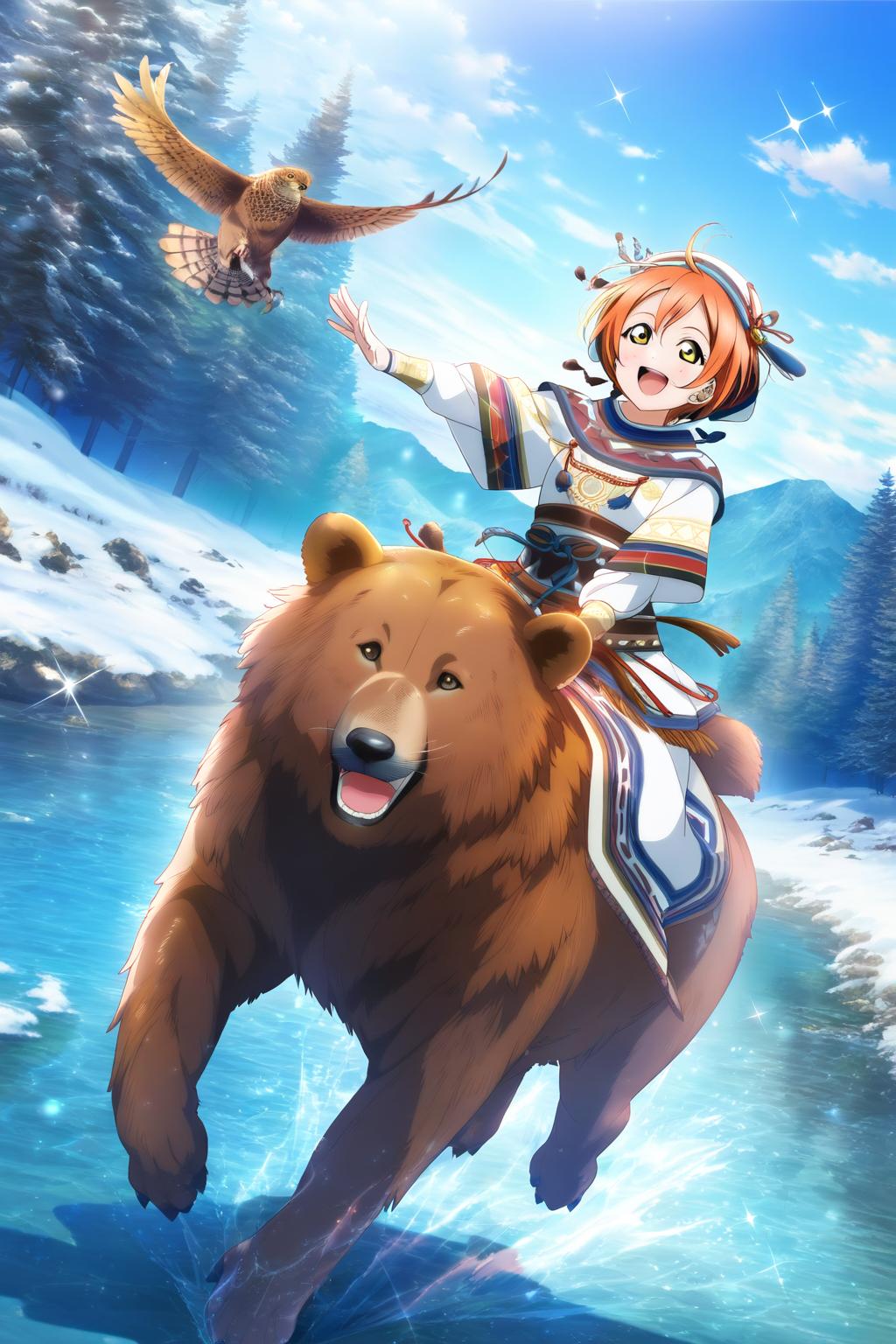 コンセプトは昔懐かしサムライスピリッツのリムルルのコスプレをした凛ちゃん。最初作ったのは熊に乗ってる方ですが、主役を引き立てるため、もう一枚作り直しました。1枚目の方がコスプレとしては近いですかねぇ。タイトルはXの方でもらった素敵なリプから拝借しました。