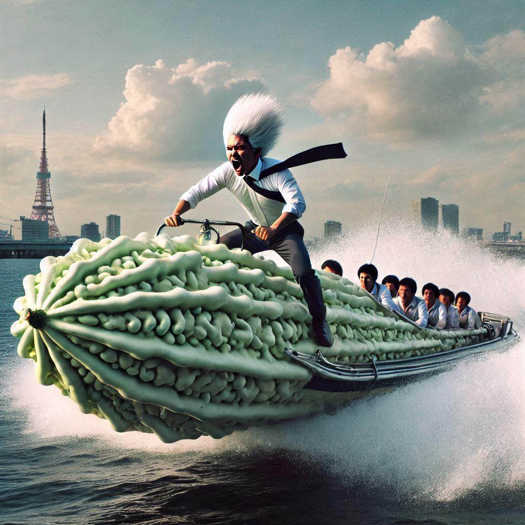 白ゴーヤジェットボートで東京湾を爆走する(株)ゴーヤの白ゴーヤ課員達。
