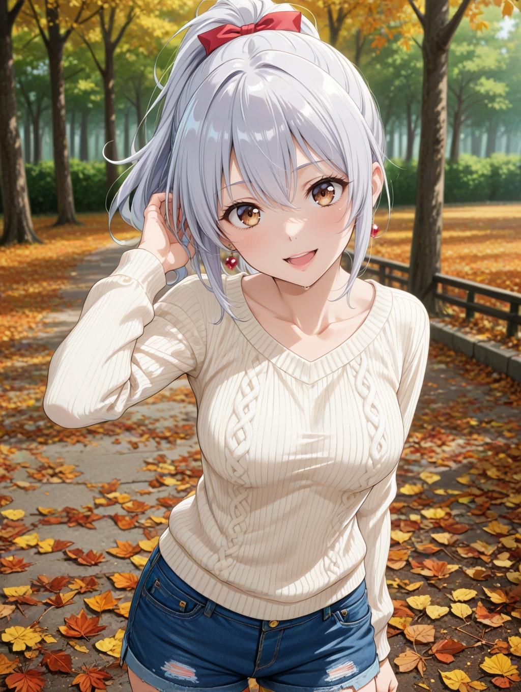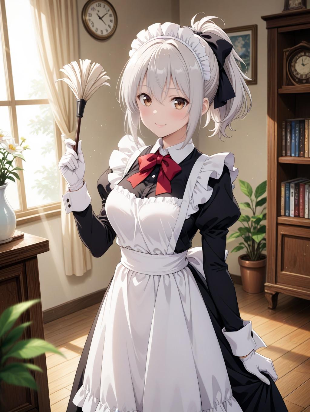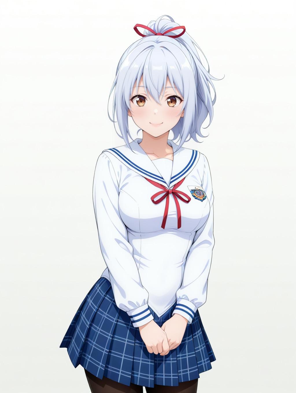 1girl,bishoujo,teen,(brown eyes:1.2),bangs,silver hair,ponytail,gradient,ponytail tied with red ribbon,medium breasts,hair between eyes