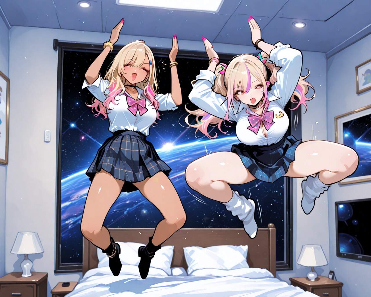 ベッドの上で飛び跳ねる2人の女性