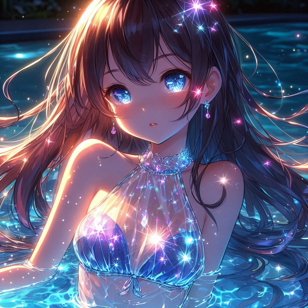 眼だけを光らせるのは労さなかったので、プールの水と水着も発光させました。