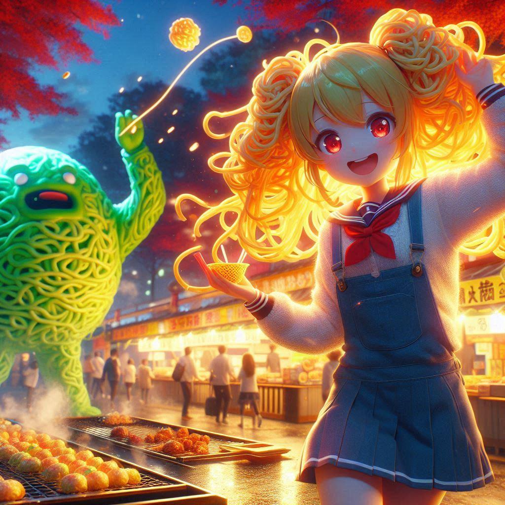 ソースちゃんは、半透明のゲル状の麺で作られた特製の「麺ムチ」を手に持っていた。これは焼きそばを素早く調理するための秘密兵器だ。麺ムチが空中で舞うたび、発光して周囲の注目を集める。