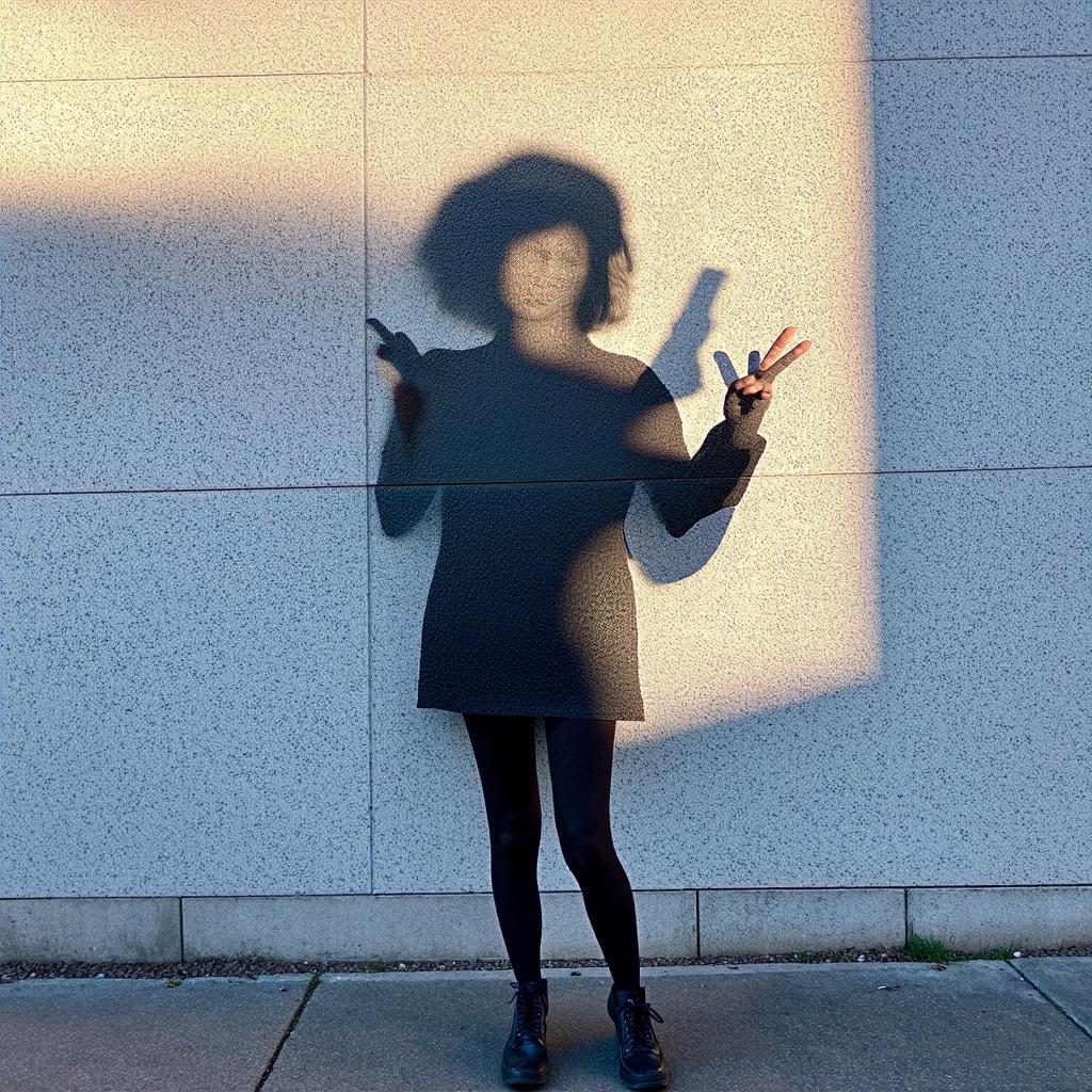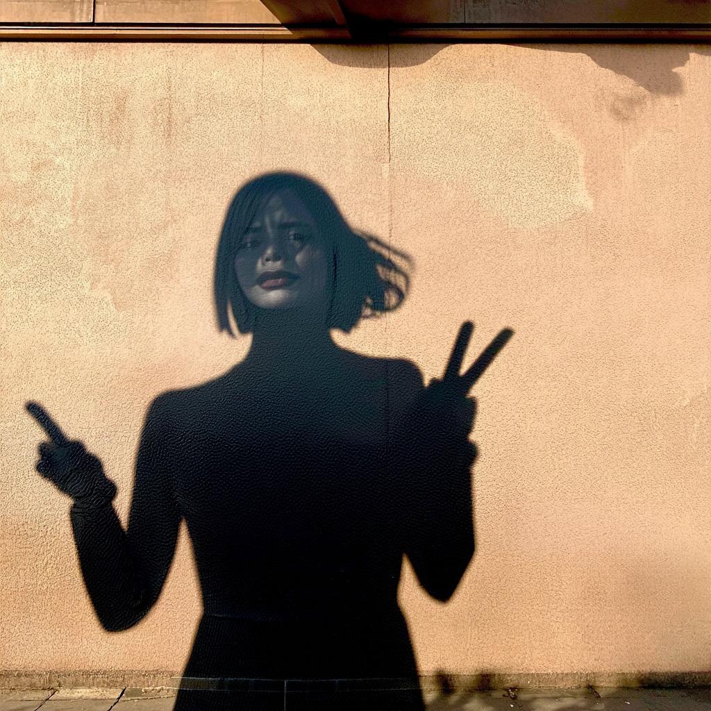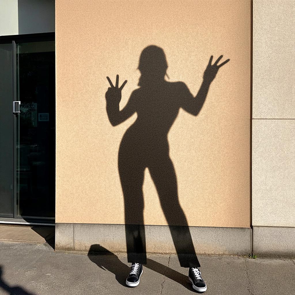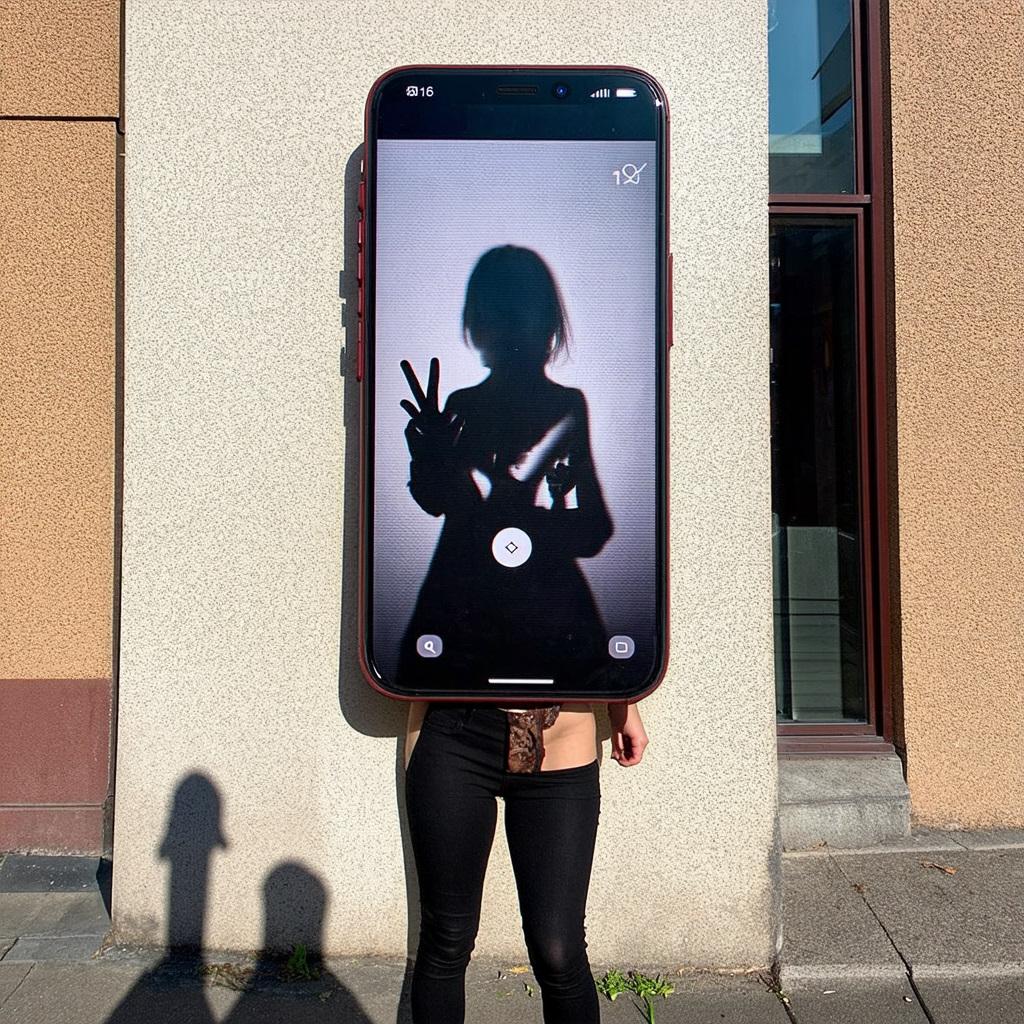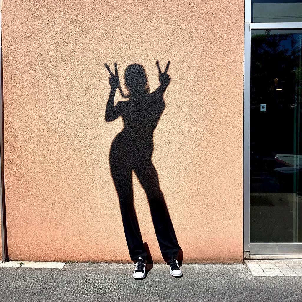 「巨大化した虚像の影が独り歩きして実体と入れ替わるSNS社会特有のメランコリーを、現代美術の風刺的アプローチで端的に描いてください。モダンなビル、スマートフォン、ピースサイン、影、どこにもいない私」