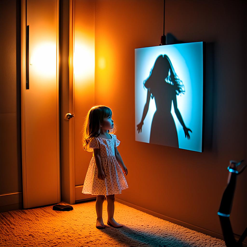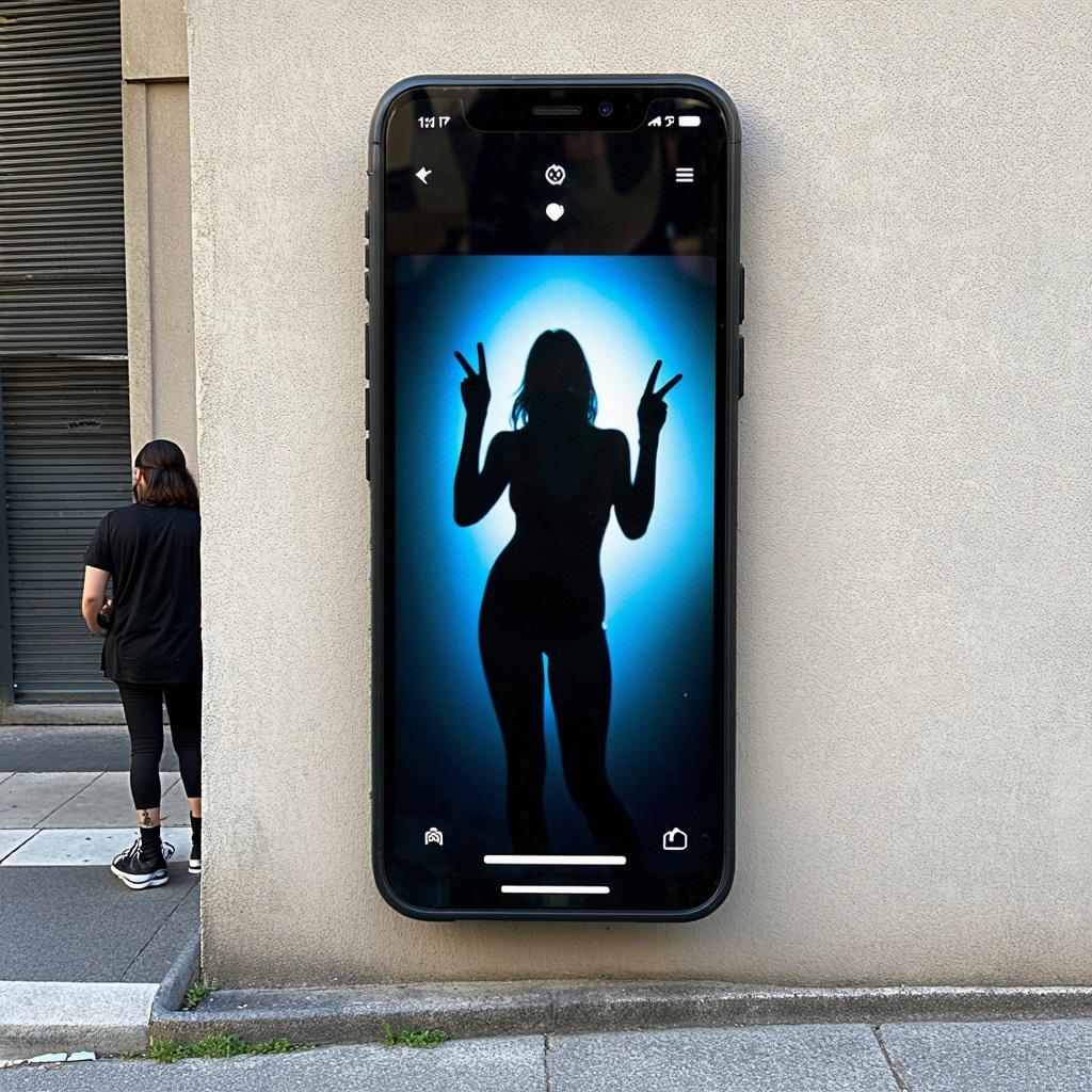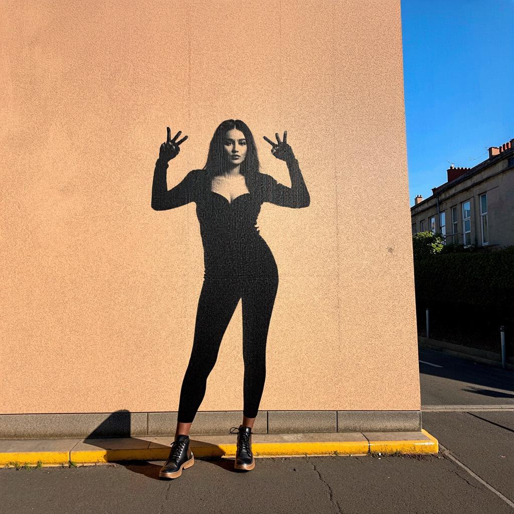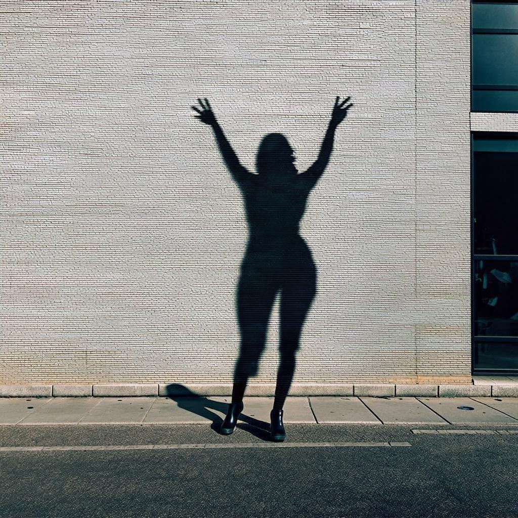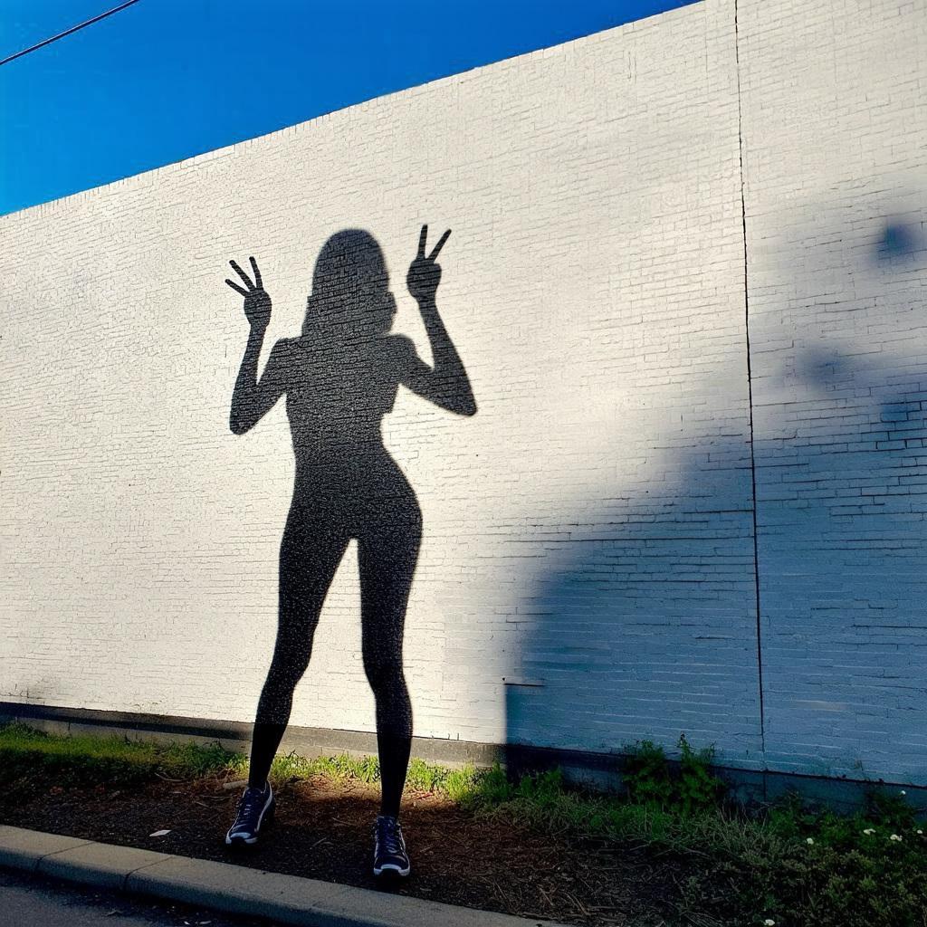 「巨大化した虚像の影が独り歩きして実体と入れ替わるSNS社会特有のメランコリーを、現代美術の風刺的アプローチで端的に描いてください。モダンなビル、スマートフォン、ピースサイン、影、どこにもいない私」