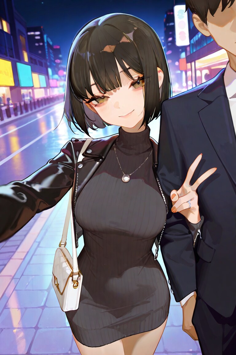 プロンプトそのままだと3枚目みたいになります(男性がスーツ着ない、女性が腕抱き&ピースしない)