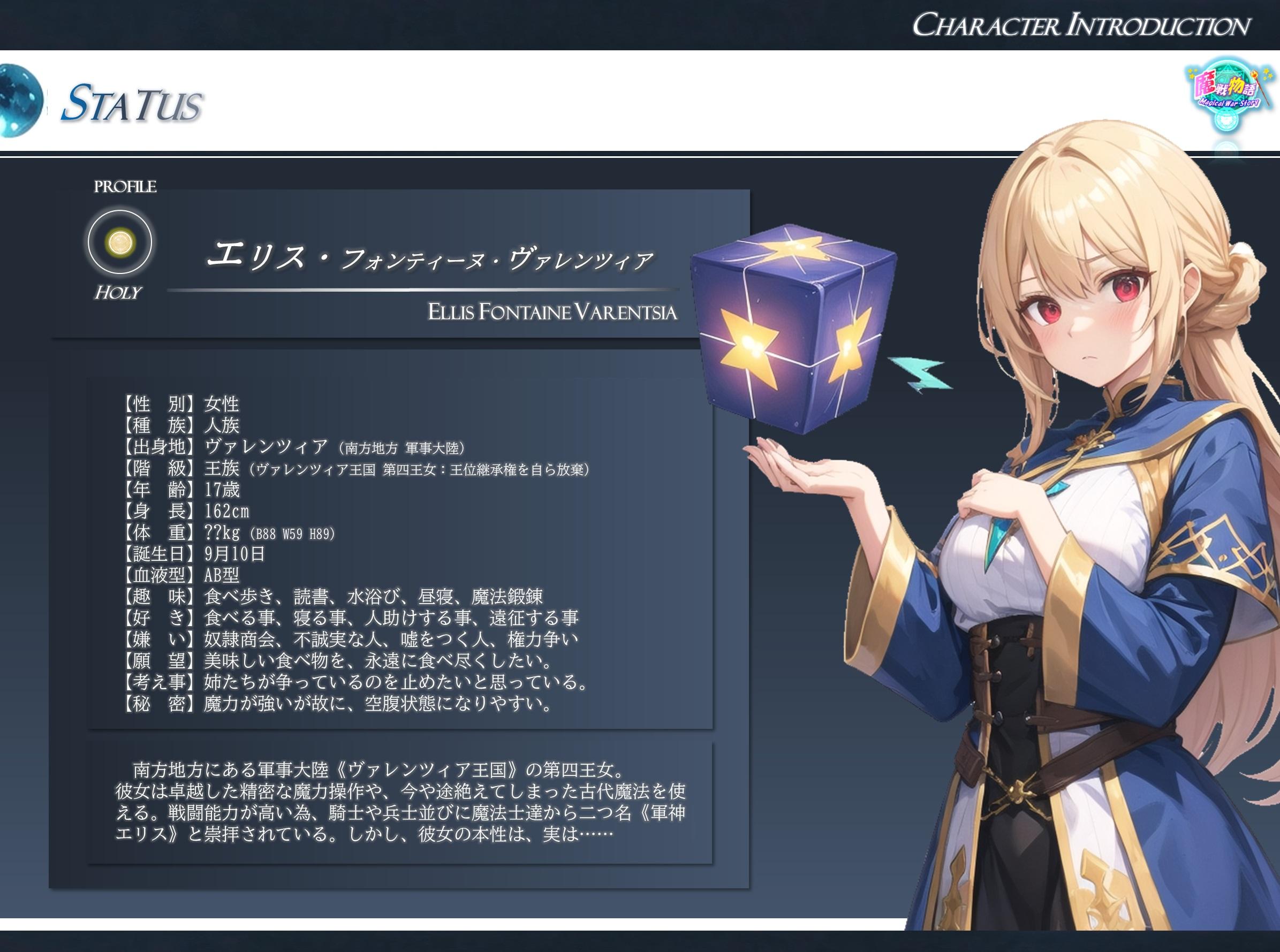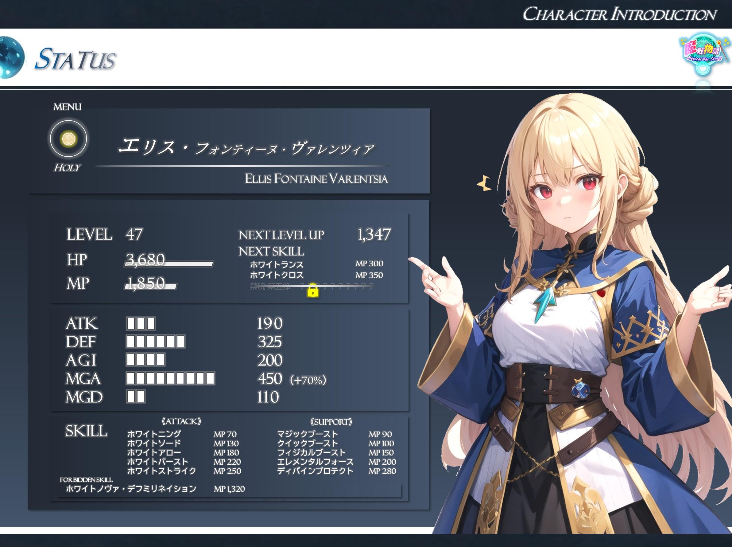 今回は『エリス・フォンティーヌ・ヴァレンツィア』のステータス画面を作りました。