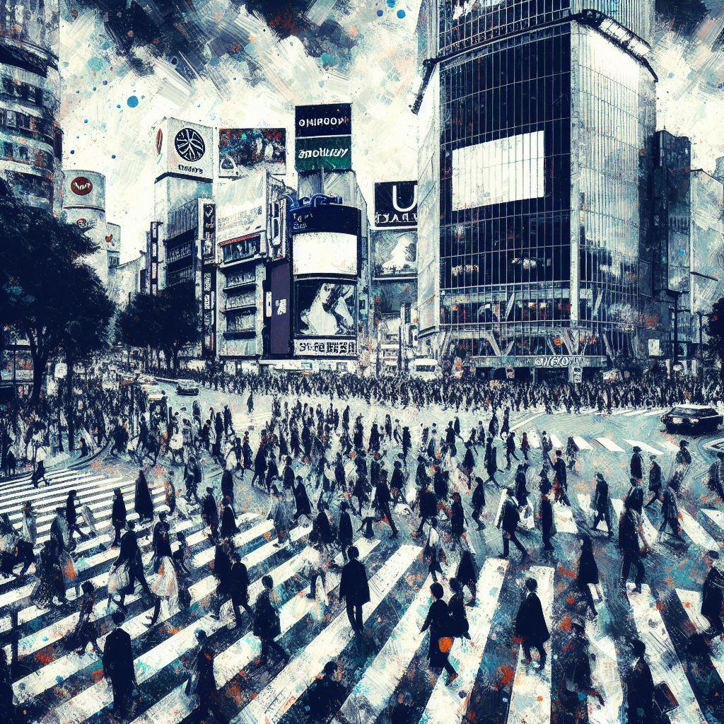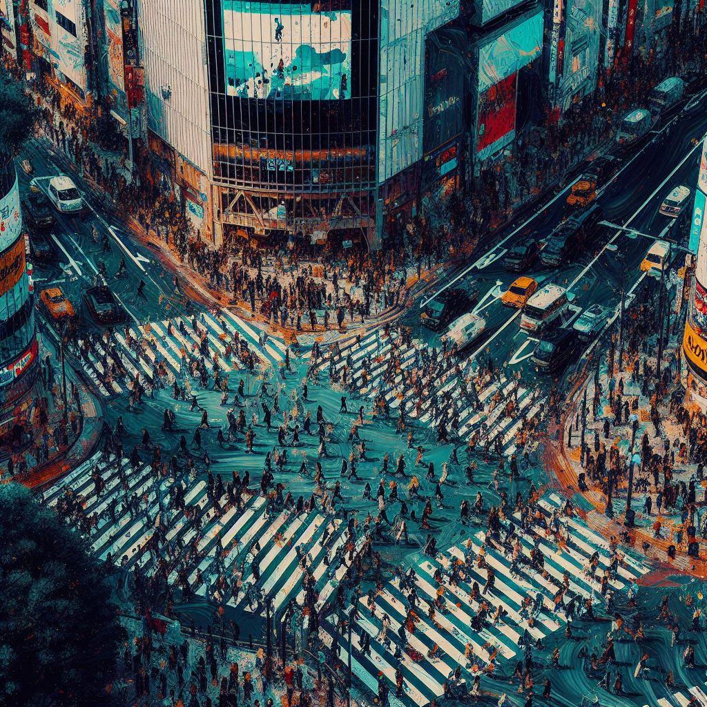 ジャクソン・ポロックの作品の特徴である、色彩豊かでランダムな線や点の模様を使って、渋谷のスクランブル交差点を表現してみました。このように描くと、渋谷のスクランブル交差点の混沌とした雰囲気や、人々の多様性や自由さが強調されると思います。By Copilot