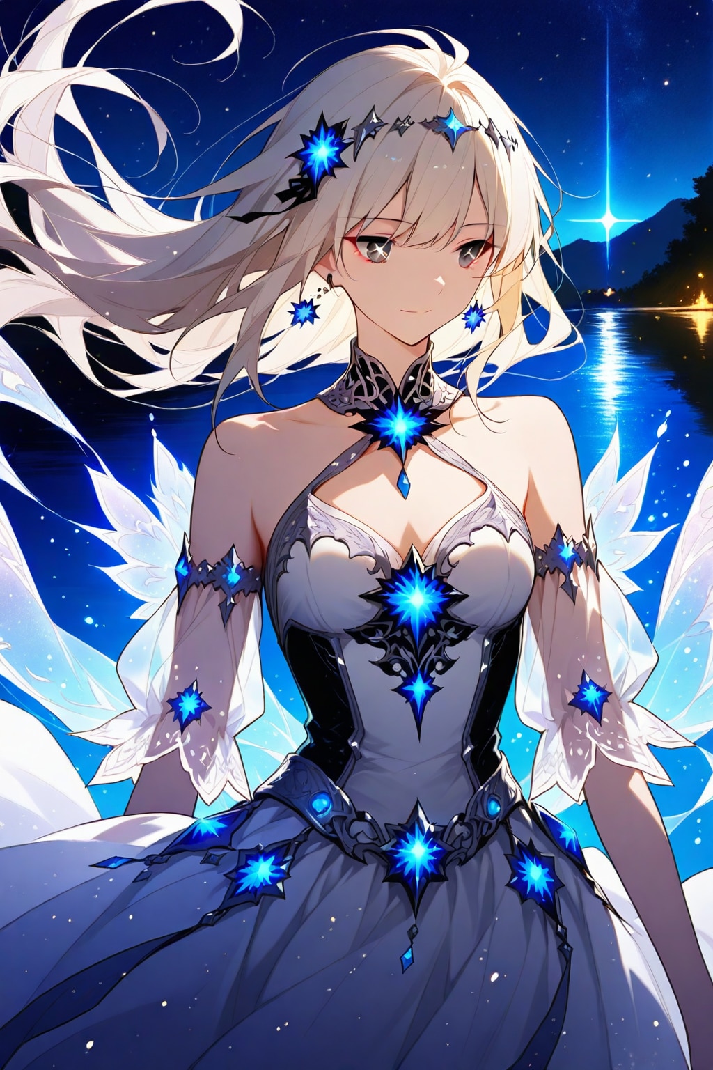 静かな湖面に夜空の星を映すエアリィは、白銀に輝く衣装をまとい宙に浮かぶ。星々の光を映す瞳と穏やかな微笑みは、夜の湖に幻想的なプリンセスの姿を描き出す。