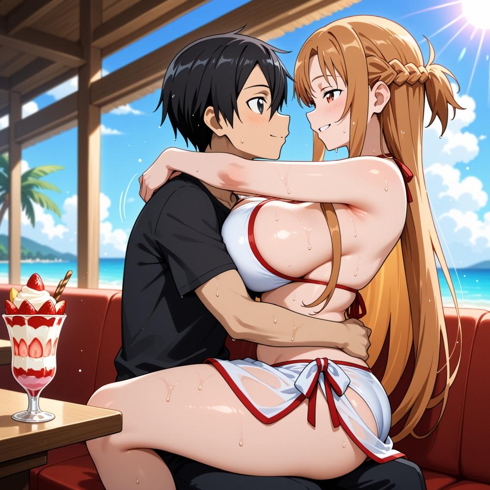 夏の水着コスプレ人妻ハグカップル&白黒絵
