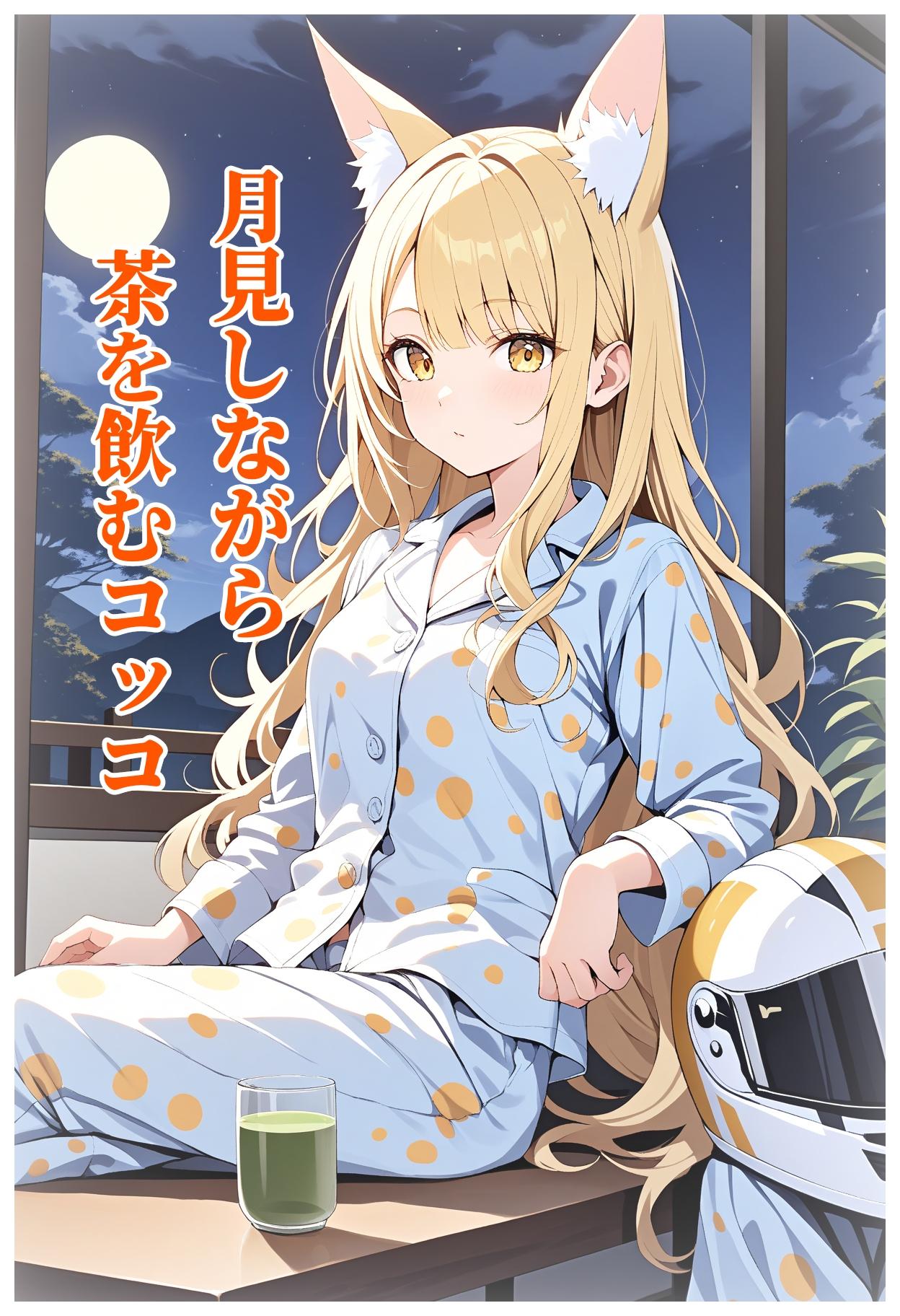 御手洗ミラ,female,solo,555歳,helmet,狐耳,金髪,長髪,金瞳,(無乳:0.7),pajama,green tea,on table,sitting on chair,calm atmospheres,