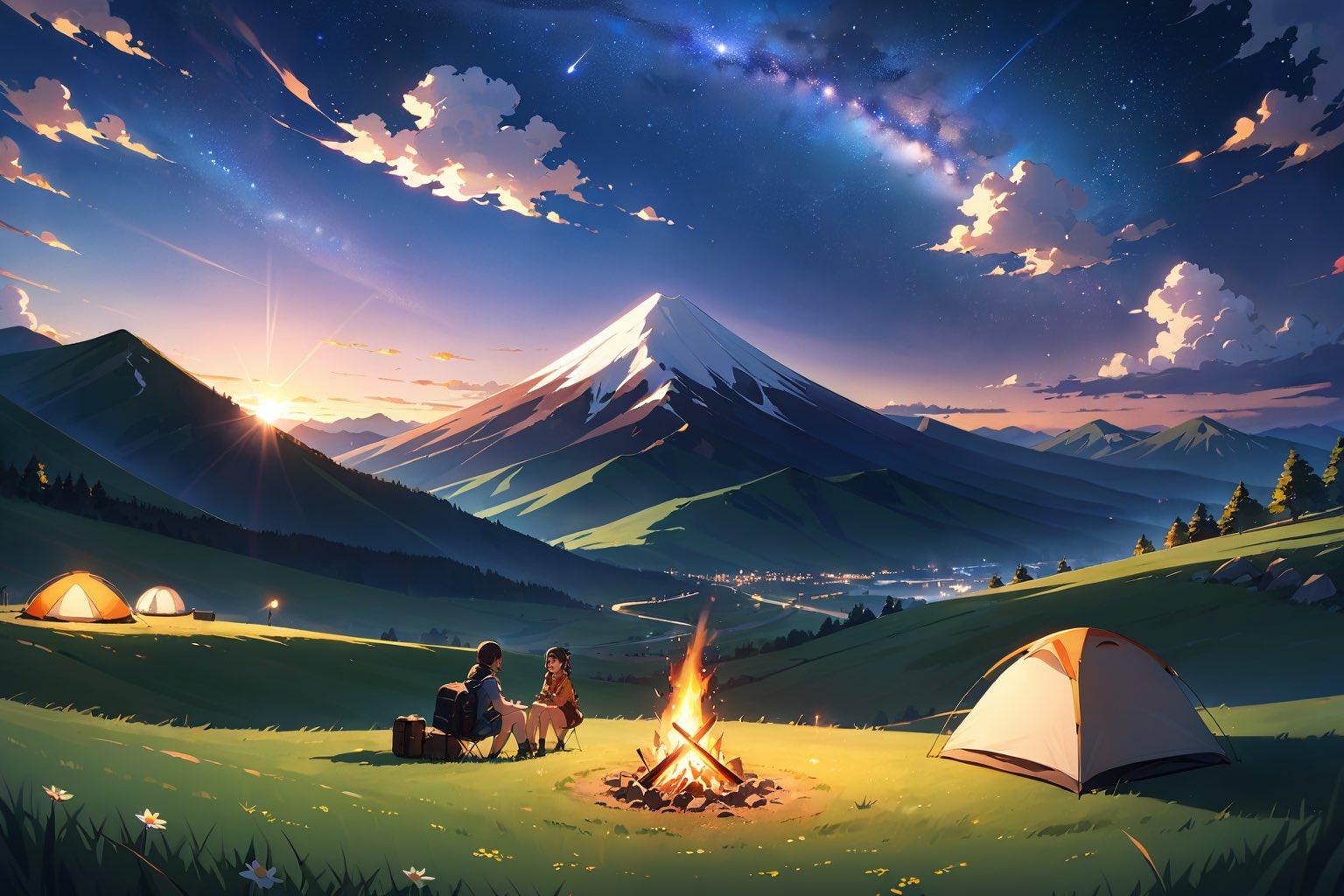 夜空と山並み、そしてキャンプ旅行者をイメージしました。最後に湖lakeをプロンプトに追加していますね。