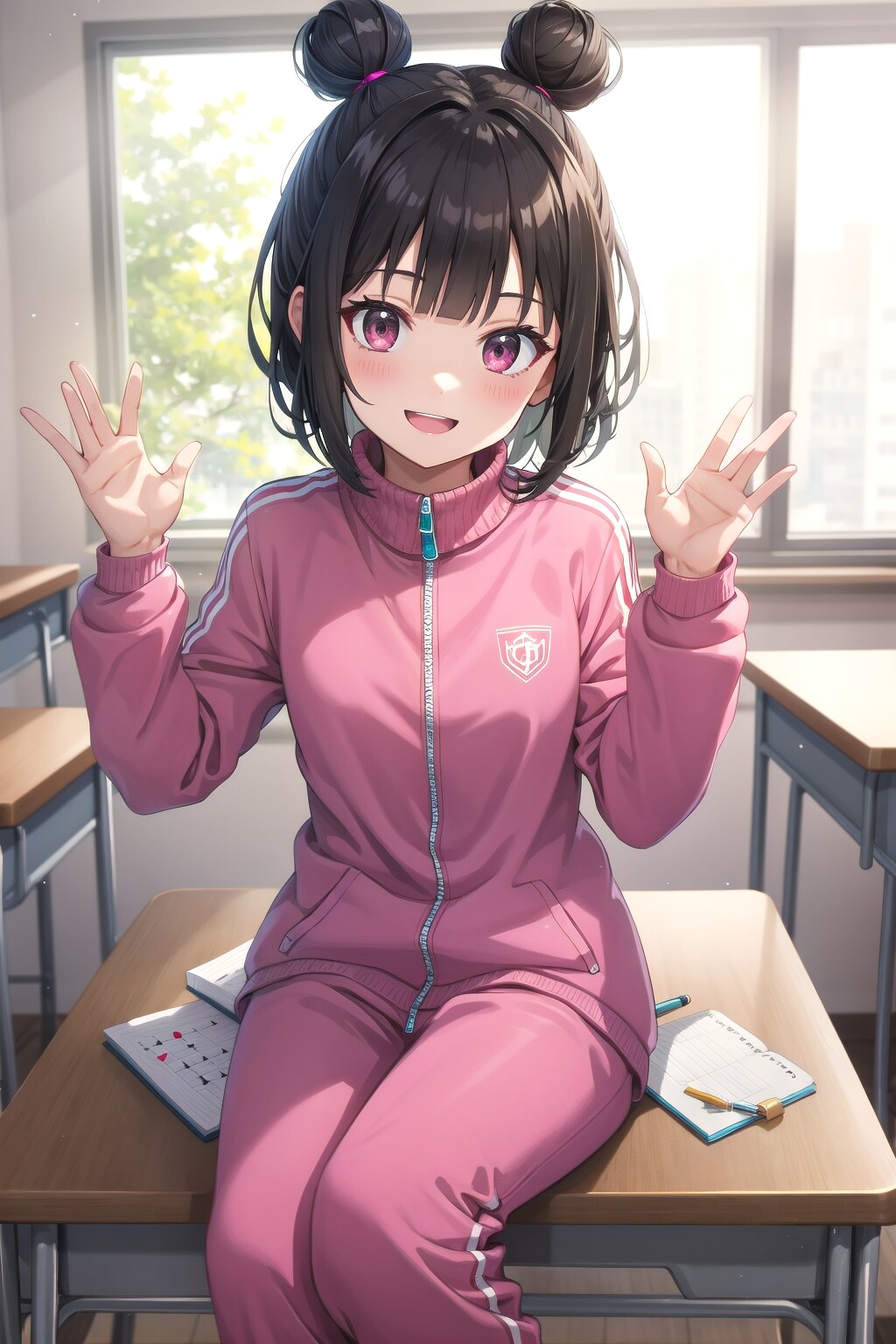 (chibi, petite), (pink princess dress:1.3), ((pastel pink) dress), (too many frills), (frilly long sleeves), (pink eyes), (beautiful black hair), ((topknot), bun), blunt bangs, smile,