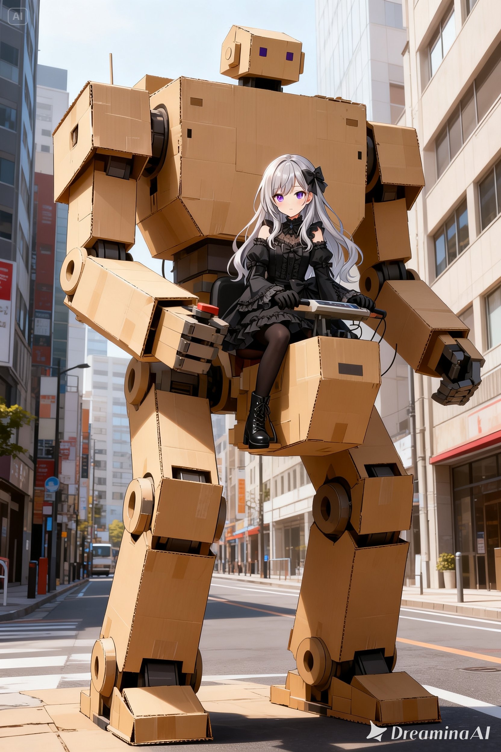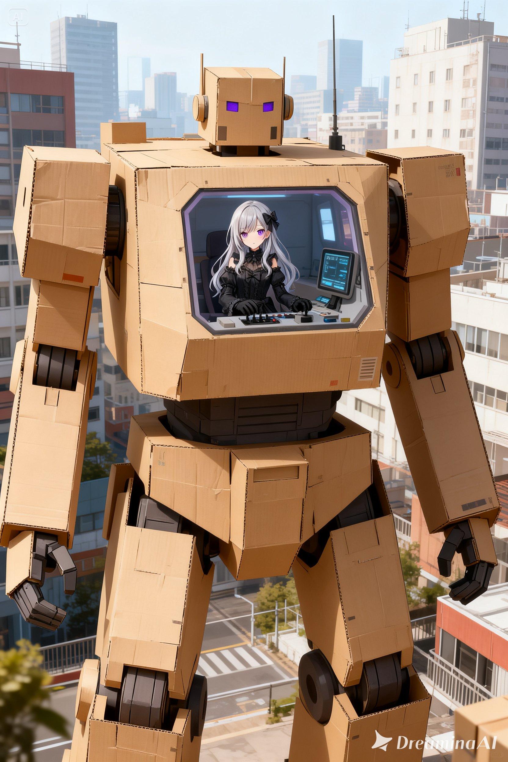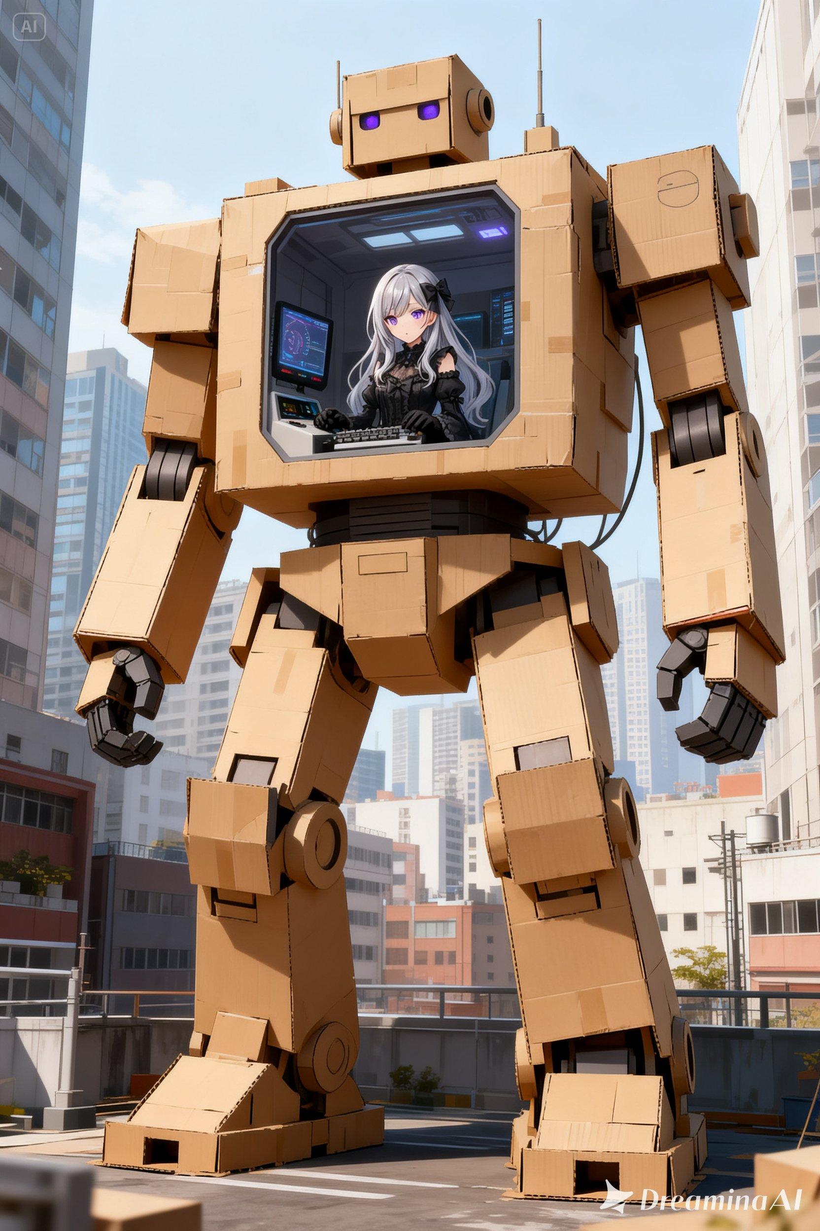 VEGAちゃんがダンボールロボットに乗って遊んでいます。