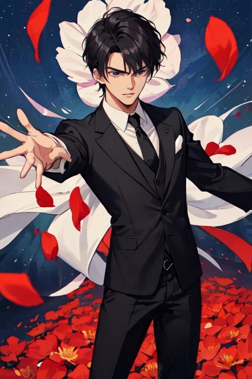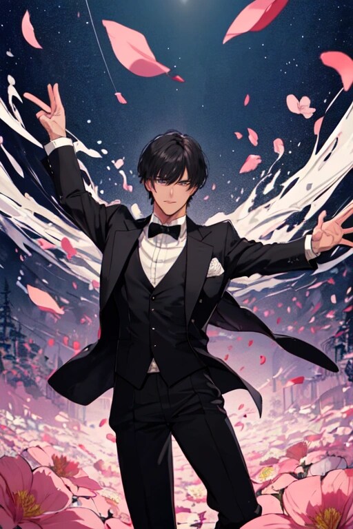 では、 花びらと両手を広げた、黒髪短髪男性をご覧下さいー。