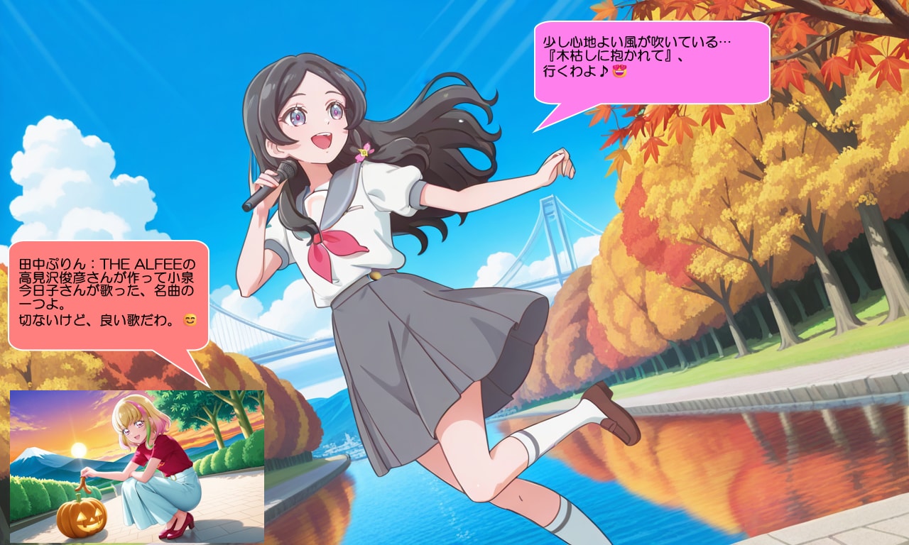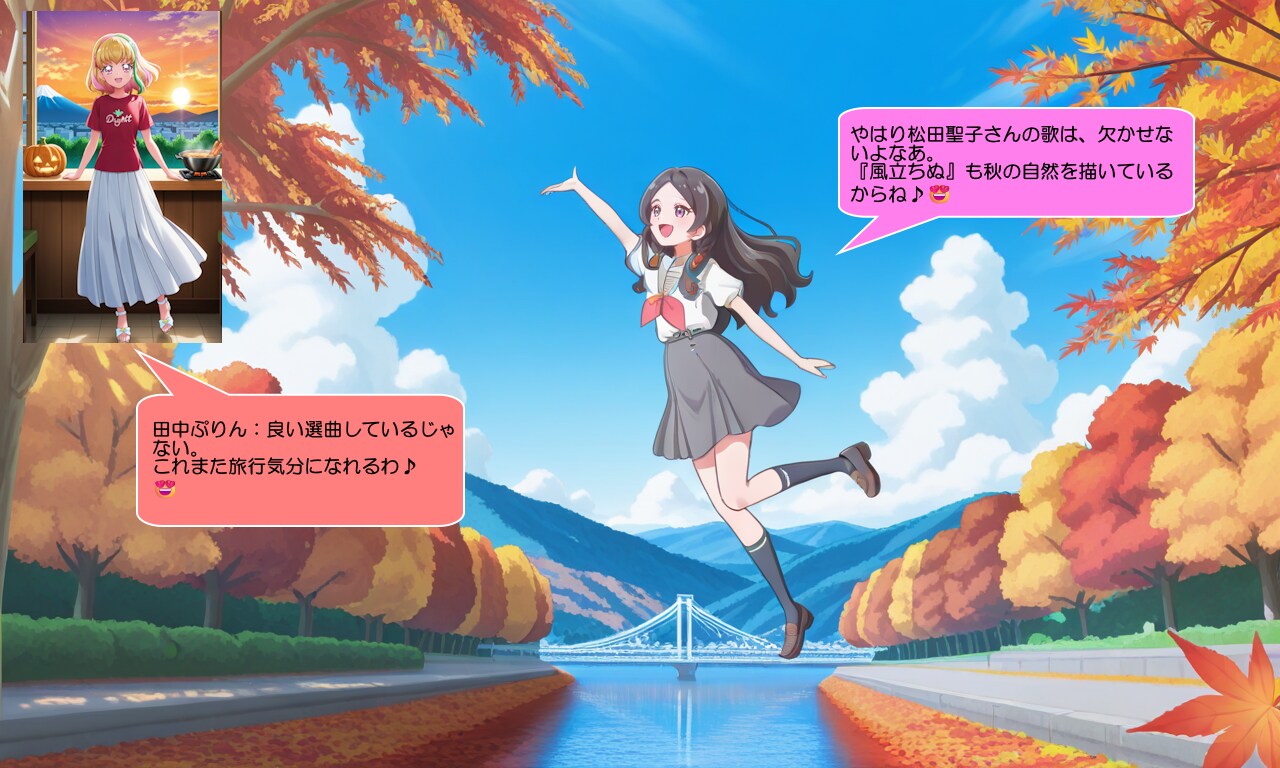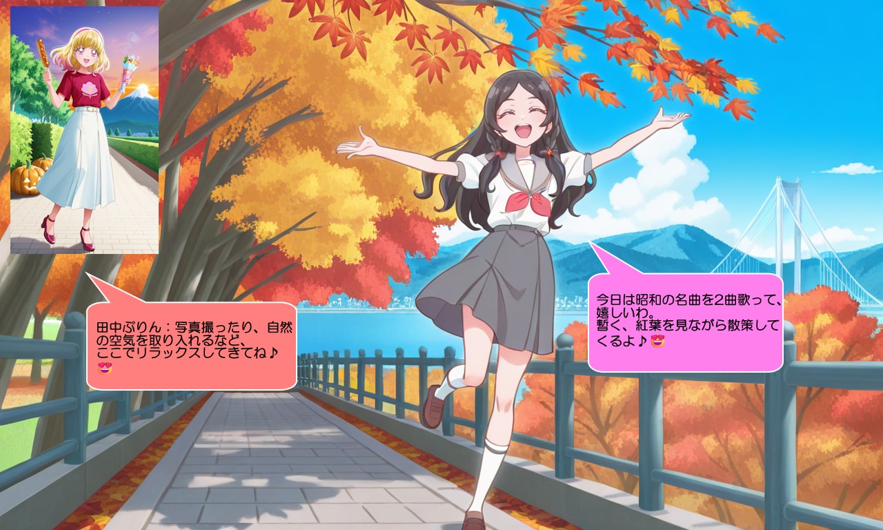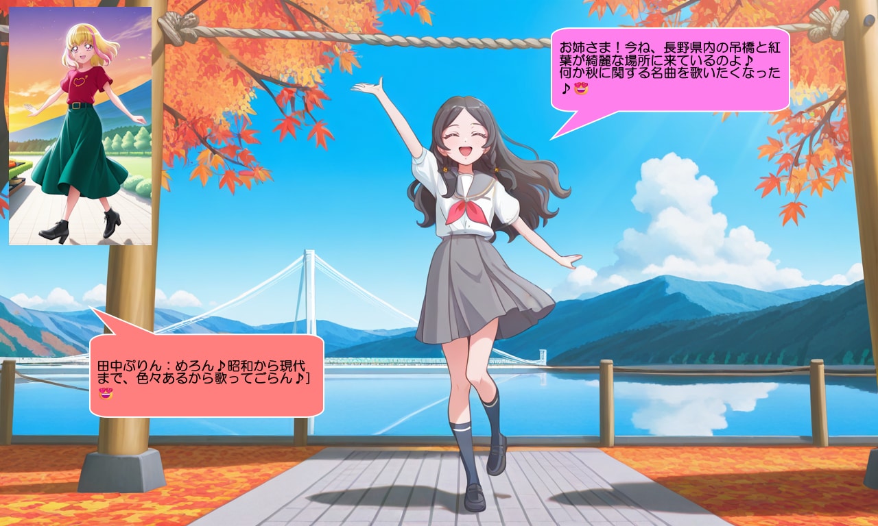 田中めろん:お姉さま!今ね、長野県内の吊橋と紅葉が綺麗な場所に来ているのよ♪何か秋に関する名曲を歌いたくなった♪😍
