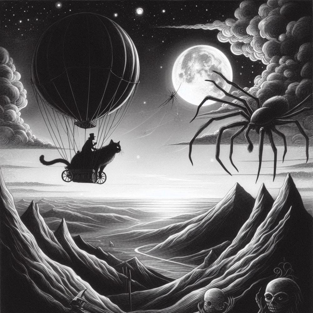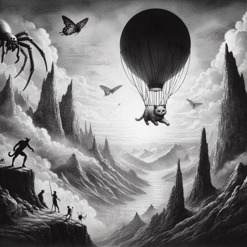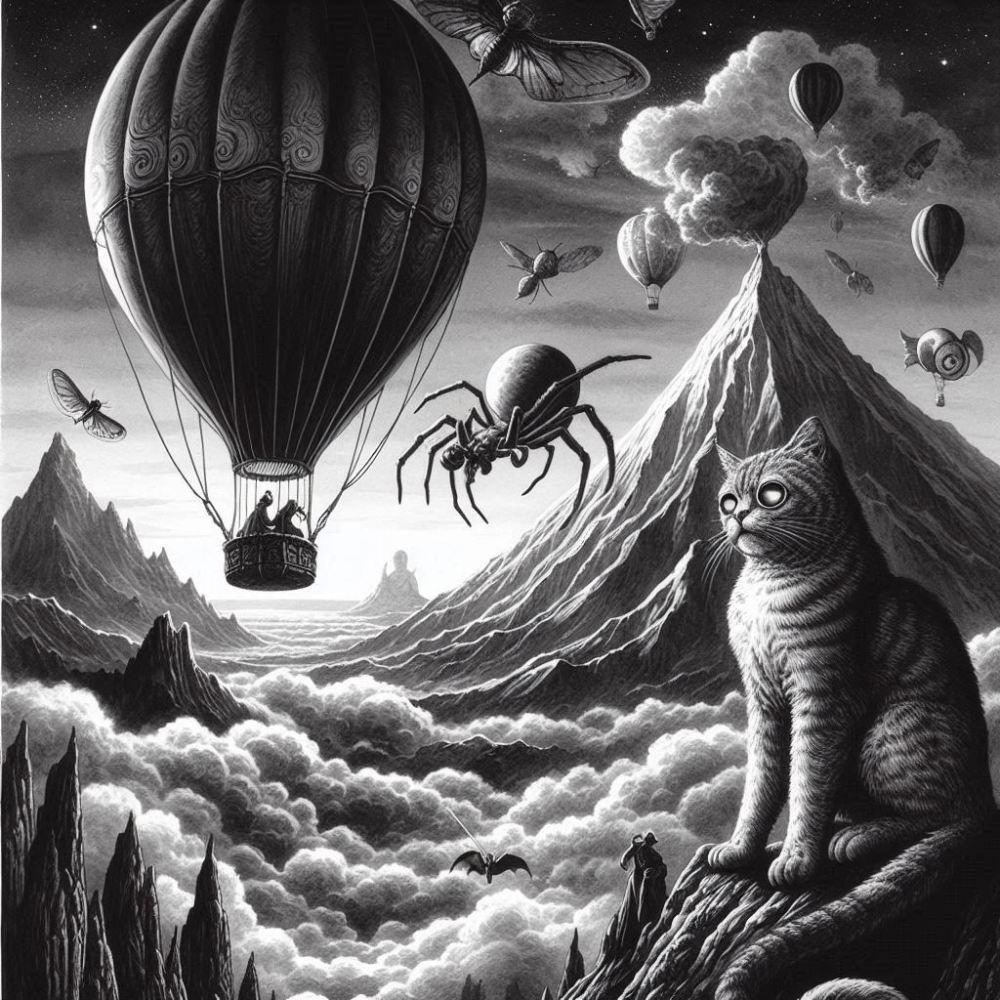 モノクロインク画ファンタジー、気球に乗り旅をする猫