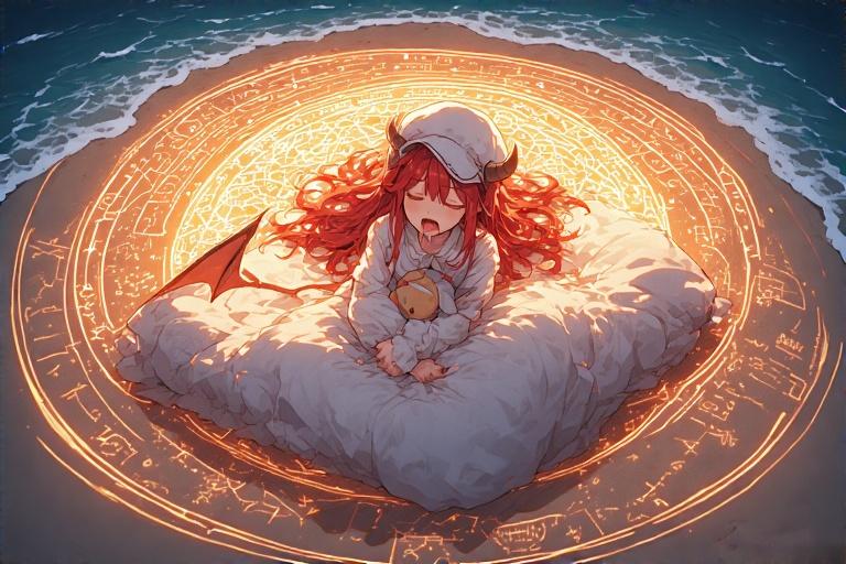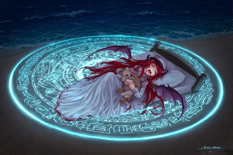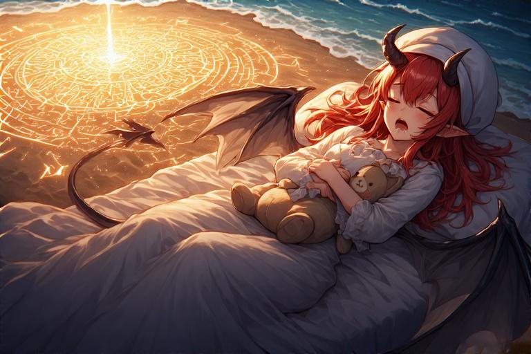 海辺に巨大な魔法陣が現れベッドごと睡眠中の悪魔が召喚された