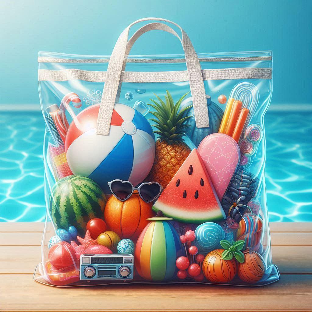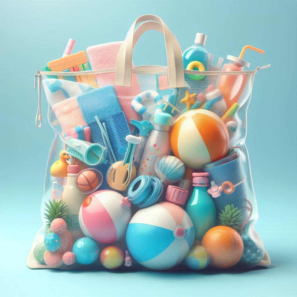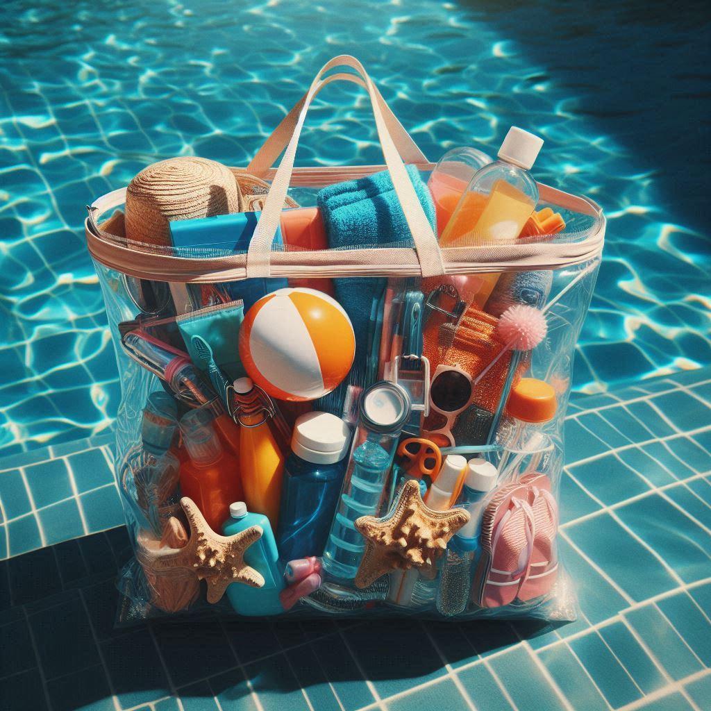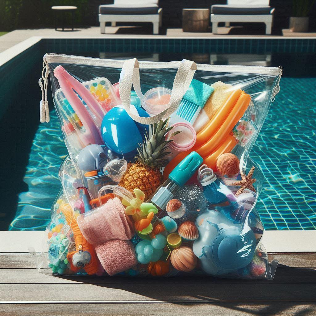 『プールグッズの詰まった透明なプールバッグ。』