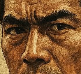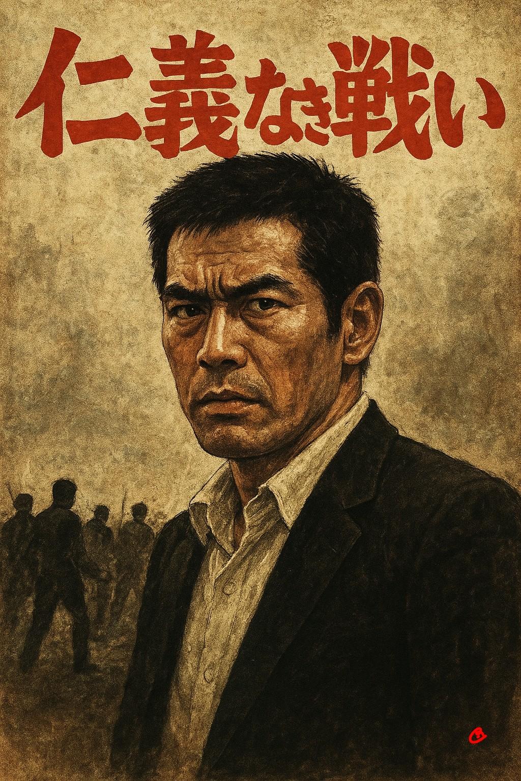 ポスター、映画ポスター、昭和、昭和映画、昭和映画のレトロポスター、映画 「仁義なき戦い」 風のポスター、赤色のタイトル、映画タイトルはオリジナルで「仁義なき戦い」風で、映画ポスターの構図、登場人物 菅原文太風の人物がいる、迫力あるタイトル文字と構図に菅原文太風の人物のポスター風の画像縦長サイズを作って下さい