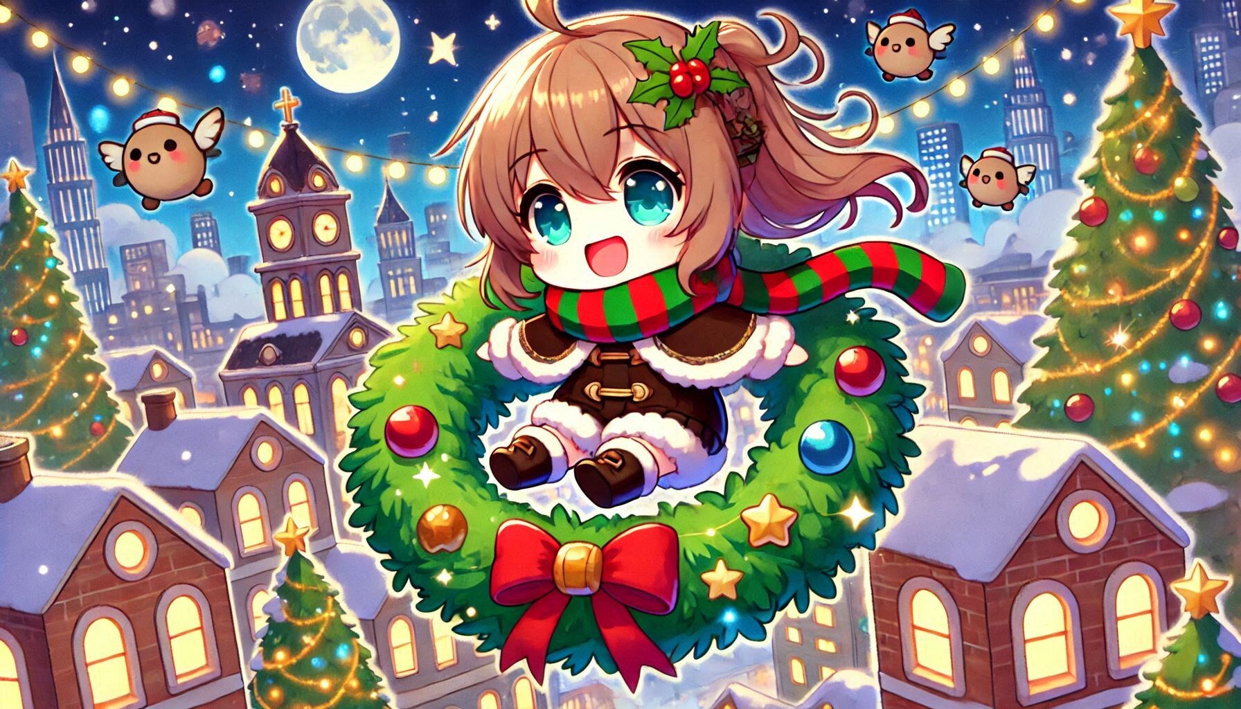 空飛ぶクリスマスリースを楽しんでいるちびちゃん
