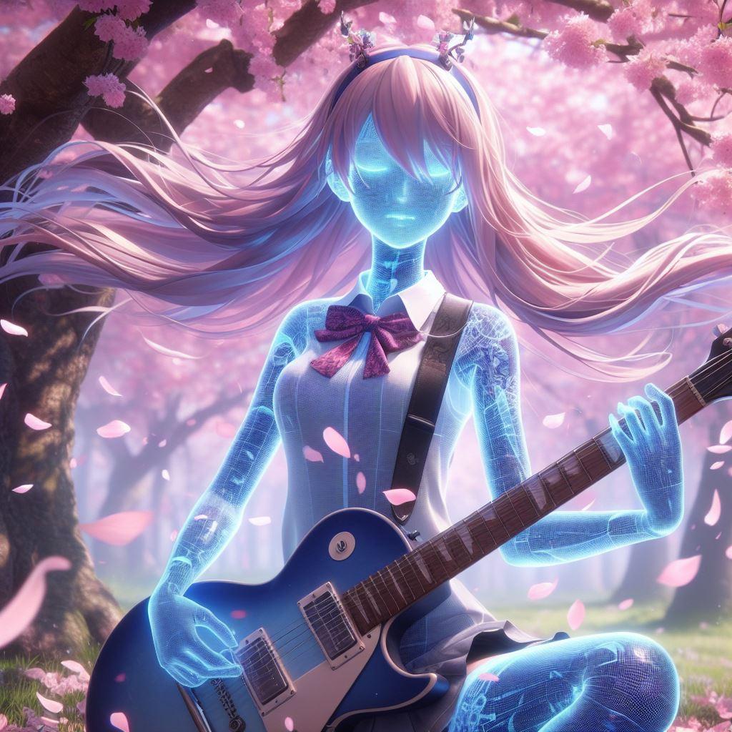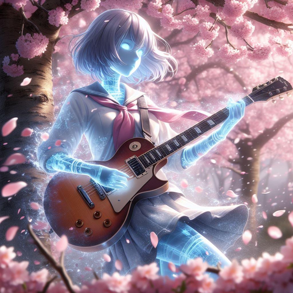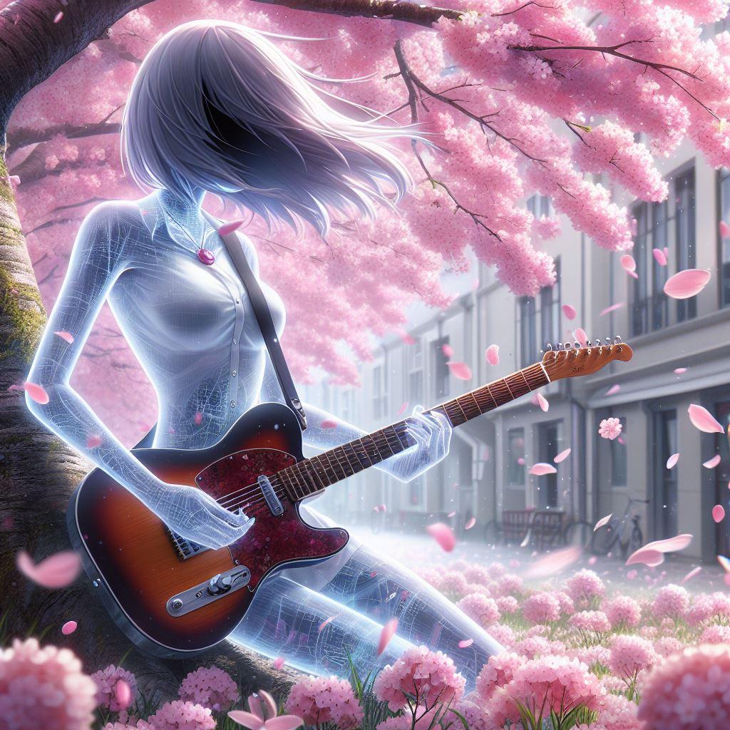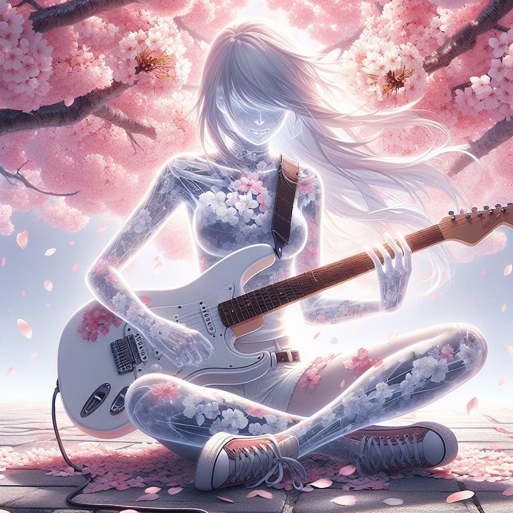 透明人間が桜の木の下でエレキギターを演奏しています。