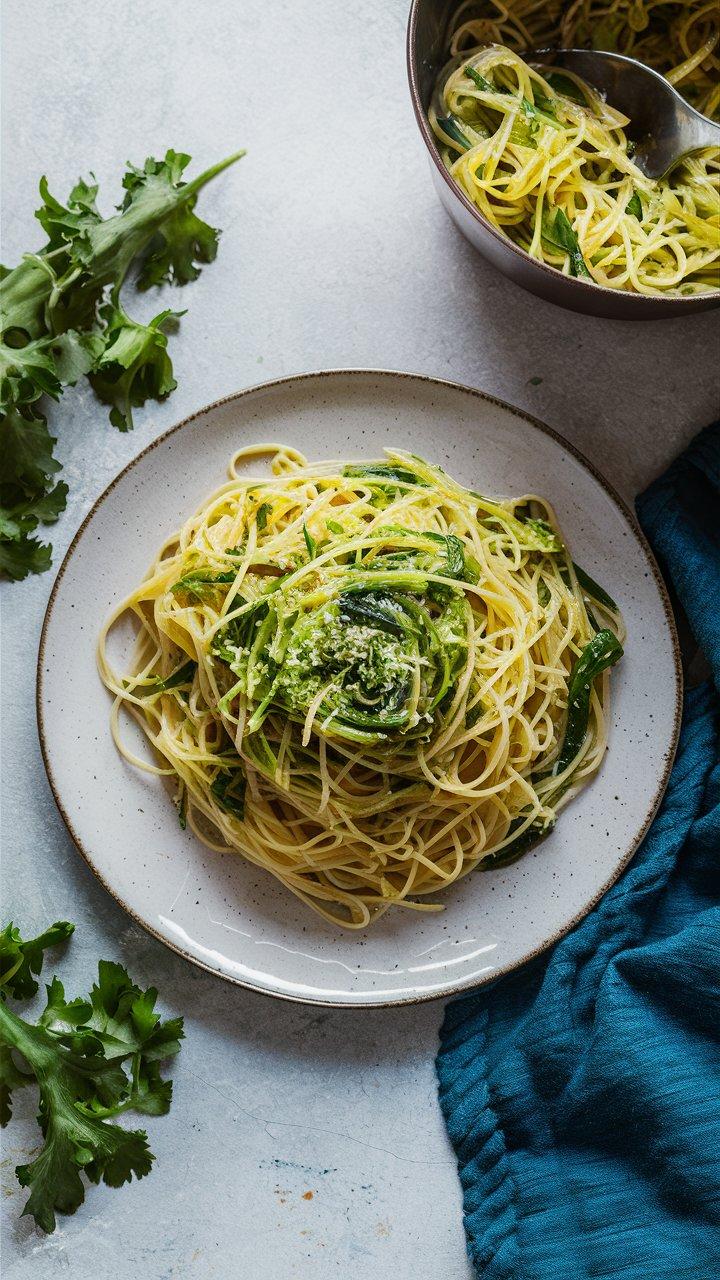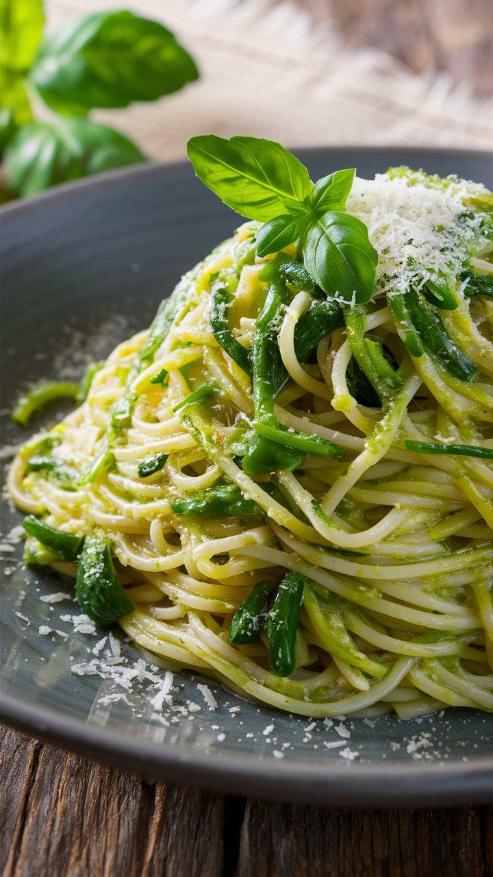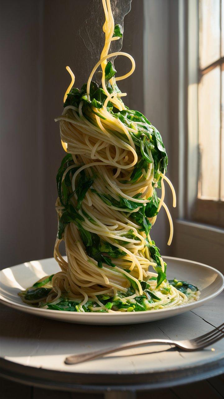 オリジナルプロンプトは「Spaghetti on a plate on the table with fresh green vegetable sauce」