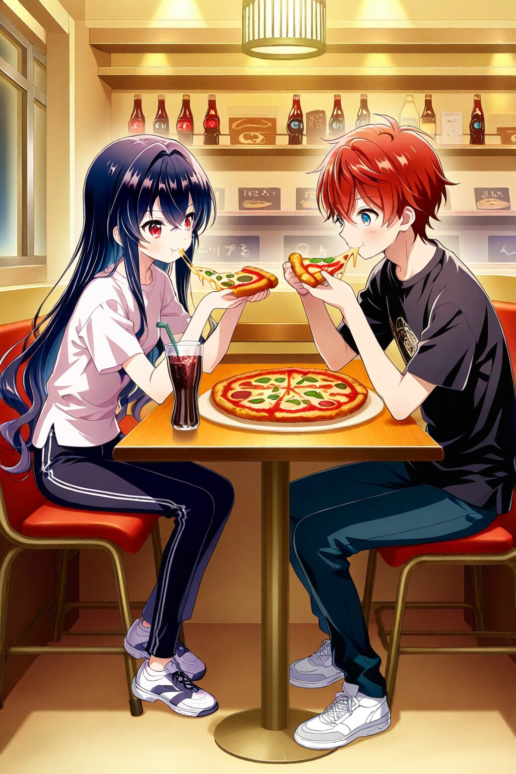 もちろん、黒髪ロングの子が彼氏で、赤髪ショートの子が彼女ですよ!